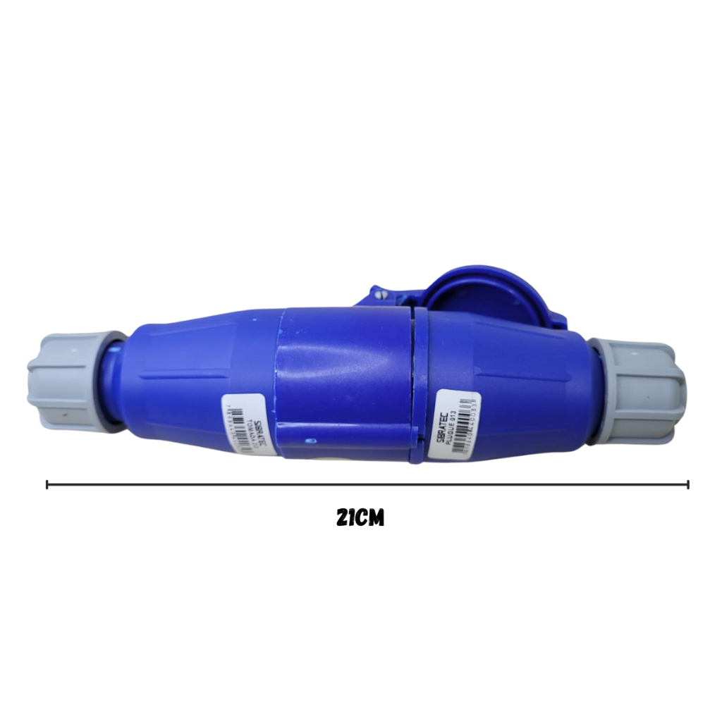 Plugue Macho 16a 2 polos + terra Plugue fêmea (acoplamento) 16a 2 polos + terra Características gerais da Linha IP44: Matérias primas: Partes plásticas – termoplástico de engenharia auto-extinguível (nylon 6.6) – “GW Test” 650 / 850°C; Partes condutoras: latão Temperatura de operação: -20°C a 120°C; Construção: conforme norma NBR IEC 60309-1 e NBR IEC 60309-2. Tensão nominal de operação: 220/240 Vca – cor azul ; Correntes nominais: 16a Número de pólos: 3, (2P+T, ); Frequência: 50 / 60Hz. Suporta direto no borne cabo de até 6MM