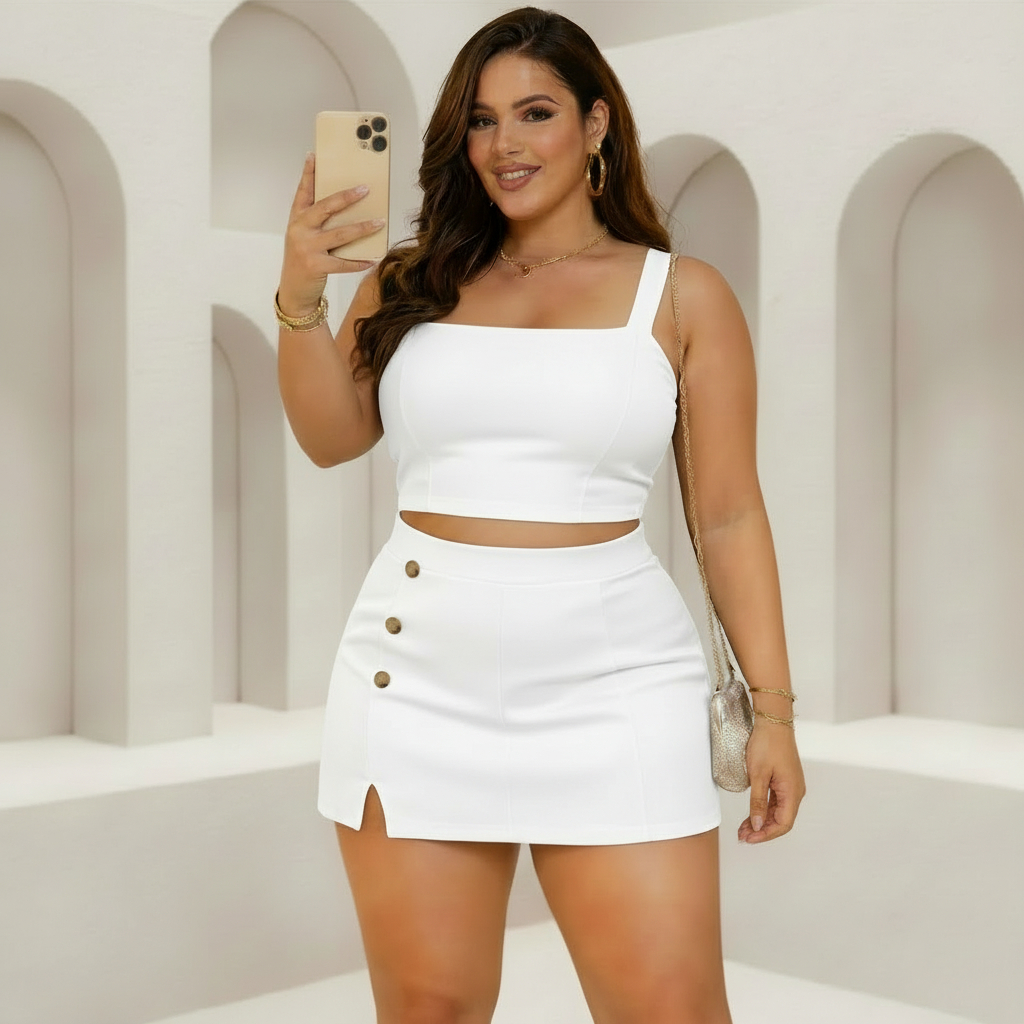 Conjunto Plus Size Cropped e Short Saia com Botões (G GG G1 G2 G3) | Tecido Premium Liverpool