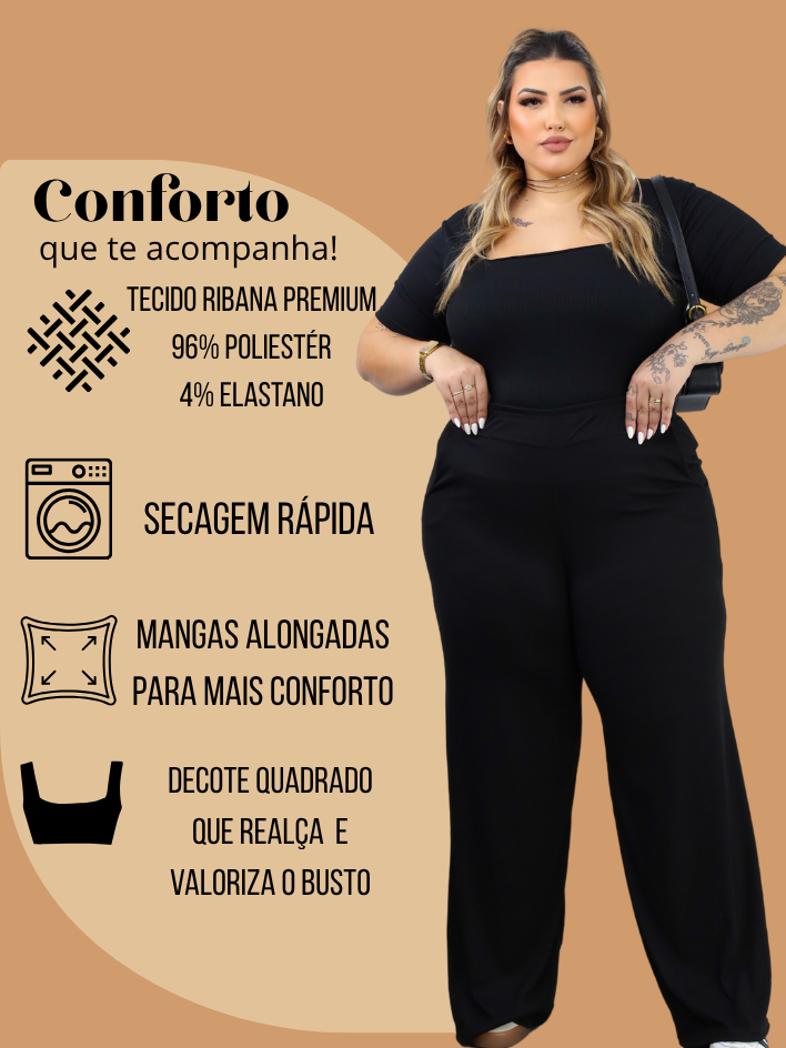 Conjunto Plus Size Feminino calça Pantalona wide leg Blusa Decote Quadrado casual alta elasticidade