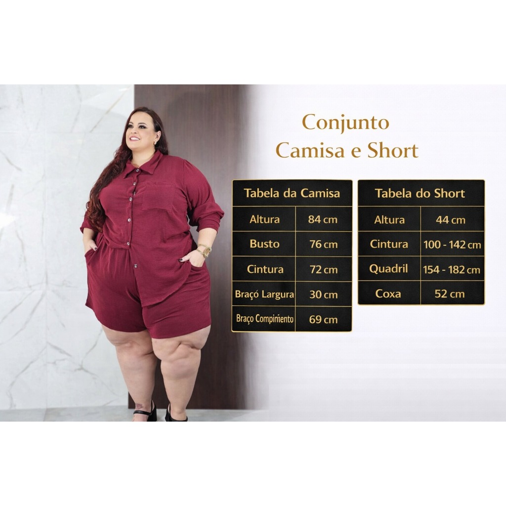 O Conjunto Plus Size Camisa e Short em tecido Duna é perfeito para quem busca um look moderno, confortável e estiloso. Com modelagem pensada para valorizar o corpo plus size, ele veste muito bem do 50 ao 60, oferecendo caimento impecável e segurança ao vestir. A camisa possui fechamento em botões, gola e bolso frontal, trazendo um toque elegante e versátil. O short complementa o visual com conforto total e ótima mobilidade, ideal para o dia a dia, passeios, viagens e ocasiões casuais. O tecido Duna tem toque macio, excelente caimento e proporciona conforto durante todo o uso, além de ser uma opção que não marca com facilidade e valoriza a silhueta. Detalhes do Produto Produto: Conjunto Plus Size Camisa + Short Peças: 2 (camisa e short) Camisa: gola, botões frontais, bolso no peito, manga 3/4 (ajustável) Short: modelagem confortável Tamanho: único Veste: do 50 ao 60 Tecido: Duna Estilo: casual, elegante, moderno Benefícios (quebra de objeções) Plus size real: veste do 50 ao 60 com conforto Modelagem que valoriza o corpo Camisa alongada: disfarça região do abdômen e quadril Tecido Duna com ótimo caimento e toque leve Look versátil: pode usar junto ou separado Ideal para dias quentes e meia estação Como usar (ideias de look) Use com salto para um visual elegante Combine com tênis para um look casual e confortável Use a camisa aberta com top por baixo Short pode ser usado com regata, cropped ou t-shirt