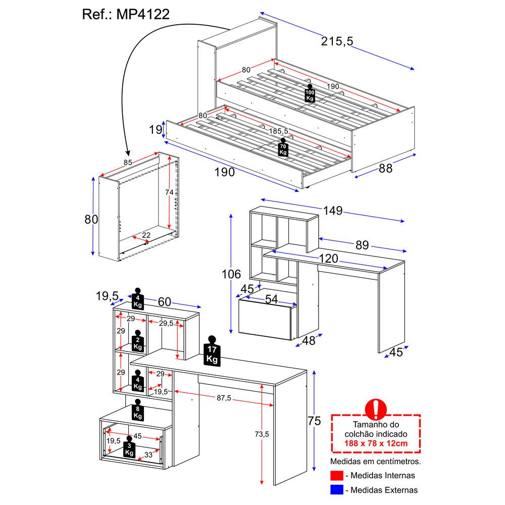 O Conjunto Quarto Bicama com Baú e Escrivaninha Multimóveis MP4122 é ideal para criar um design moderno em seu ambiente. A escrivaninha é produzida em MDP com acabamento acetinado (cerca de 20% de brilho), que garante maior durabilidade e resistência, além de um acabamento superior. Prática e funcional, possui uma gaveta com corrediças metálicas (mais leveza no manuseio), 3 prateleiras para manter o seu ambiente organizado e um tampo espaçoso para equipamentos e materiais de trabalho (suporta até 17 Kg). Já a bicama solteiro para colchão 188x78cm, é produzida em MDP com acabamento em pintura UV Premium de alta resistência. Possui um baú embutido com um amplo espaço para acomodar as roupas de cama e outros pertences, deixando o seu ambiente organizado. Bicama suporta até 100kg cama pricipal / 70kg cama auxiliar e NÃO acompanha colchão. Conteúdo da Embalagem: 1 (uma) Escrivaninha 1 (uma) Bicama Kit Ferragem Manual de Montagem Dimensões do produto montado: Escrivaninha - Altura: 106cm | Largura: 149cm | Profundidade: 48cm Bicama - Altura: 80cm | Largura: 215,5cm | Profundidade: 110cm (aberta) 88cm (fechada) Colchões Indicados: 188cm x 78cm x 12cm *Você pode consultar as medidas detalhadas na imagem técnica do produto. As cores do produto podem sofrer variações de tonalidade de acordo com as configurações do seu dispositivo. Imagem meramente ilustrativa. Decoração não acompanha o produto. O produto será entregue desmontado e não disponibilizamos o serviço de montagem.