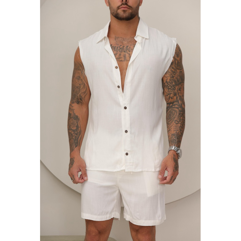 Conjunto Regata Lenhador Machão Masculino Botão Côco Viscolinho Natal Réveillon Praia Branco