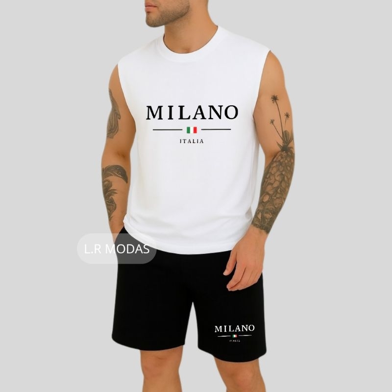 Conjunto Regata Machão Milano Italia Camisa Masculina Camiseta Algodão Bermuda Moletom com Bolso Estampado
