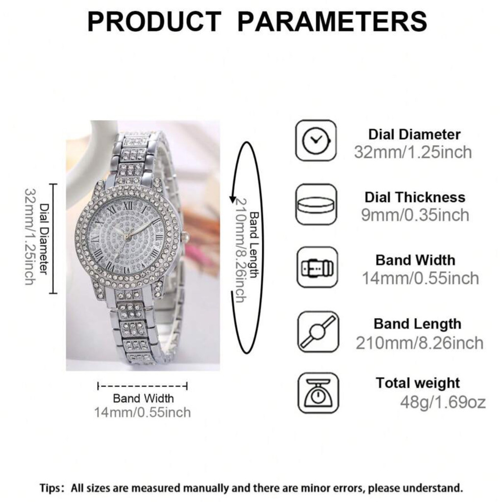 Relógio de Quartzo Prateado com Diamantes + Pulseira de Zircônia Em estoque, vendedor local, envio rápido! 【Embalagem segura e confiável】👍🏻💯 Mecanismo: Quartzo Material da caixa: Metal Material da pulseira: Metal Tipo de fecho: Fecho de joalheria Comprimento da pulseira: 210 mm Largura da pulseira: 14 mm Espessura do mostrador: 9 mm Diâmetro do mostrador: 32 mm Peso: 48 gramas Inclui: 1 relógio + 1 pulseira Todos os produtos são 100% novos e autênticos. Observe que pode haver uma diferença de cor de 1 a 5 mm devido à medição manual e às variações de cor do monitor. Nosso compromisso é fornecer produtos da mais alta qualidade a preços acessíveis. Nosso compromisso é proporcionar uma experiência excepcional ao cliente! Obrigado por navegar e comprar. Entre em contato conosco se tiver alguma dúvida. Boas compras! Se você estiver satisfeito com nossos produtos, por favor, deixe uma avaliação de cinco estrelas. Seu apoio é a nossa maior motivação!