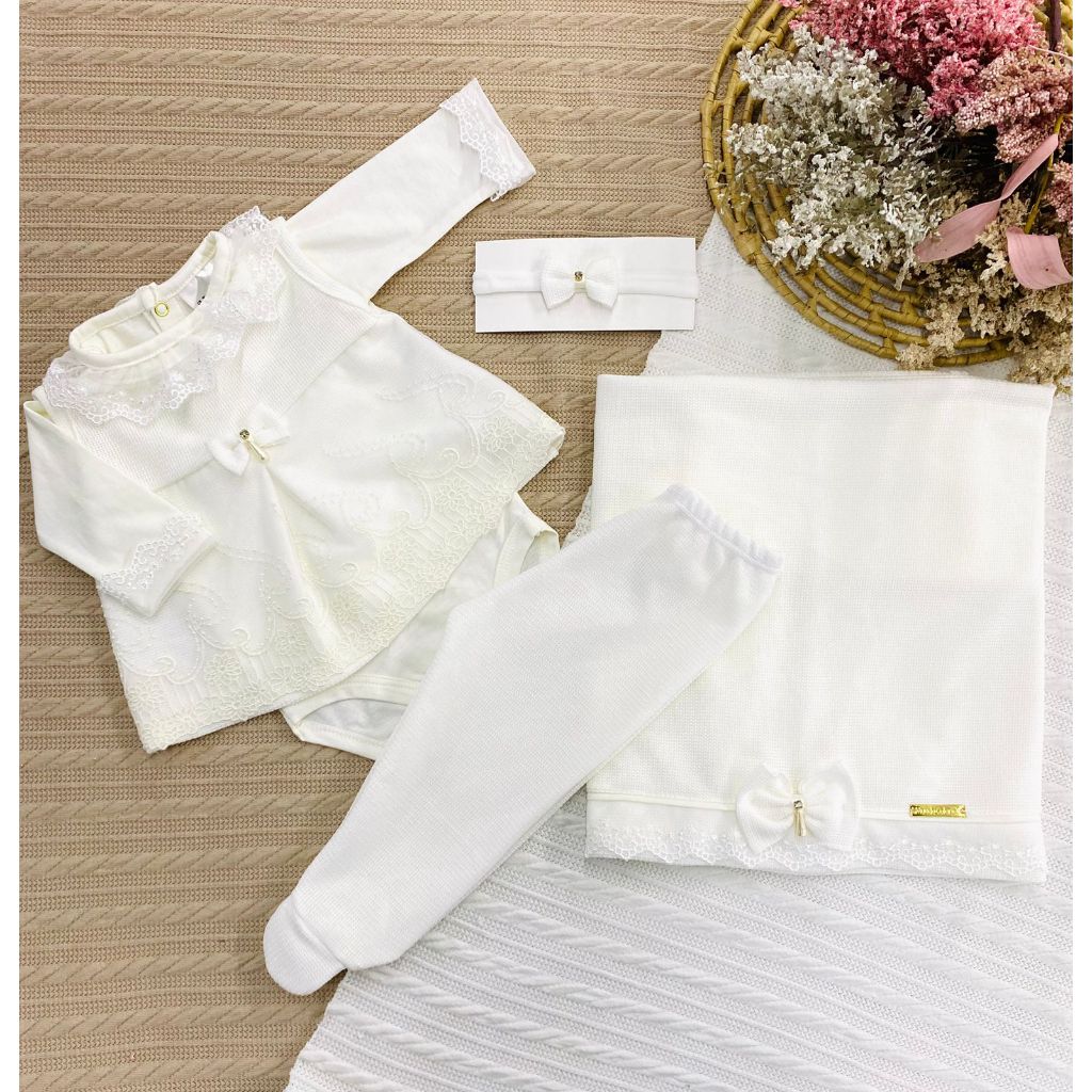 A escolha perfeita para marcar o início da vida da sua bebê com carinho e elegância. Essa saída de maternidade RN acompanha 4 peças em perfeita harmonia: body com gola arredondada e tecido suedine 100% algodão, com toque suave e acabamento premium; sobreposição em tricô com saia bordada em tule e detalhe em renda; calça com pezinho confortável e elástico suave; faixa com laço; e manta coordenada de 80x80cm, com aplicação de laço e renda. Um conjunto fotogênico, aconchegante e especial para receber sua princesa com todo amor.