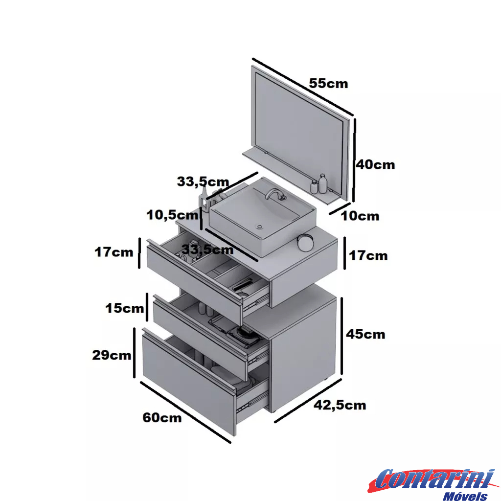 Conjunto SAFIRA COMPLETO 60CM => Inclui: gabinete, pia e espelheira + Módulo inferior. Já incluso o espelho na espelheira. SUPER LANÇAMENTO MÊS DE AGOSTO 2022!! ---- Somos Fabricantes ---- O corpo do gabinete sempre será RÚSTICO! Possuímos variações de cores para o conjunto! #### ESCOLHA ATENTAMENTE A COR ANTES DE FINALIZAR A COMPRA! #### NÃO CONSEGUIMOS REALIZAR ALTERAÇÕES NO CONJUNTO APÓS A CONFIRMAÇÃO DO PAGAMENTO! *PRODUTO TOTALMENTE RESISTENTE A ÚMIDADE E RESPINGOS DE ÁGUA! O mdf é preparado com várias camadas de fundo preparador (prime) seguido de várias camadas de tinta com secagem imediata em câmaras de luzes, garantindo uma grossa camada de material sobre a madeira, tornando-a resistente. PRODUTO: O produto é confeccionado em MDF com cortes precisos para um acabamento de qualidade. Utilizamos tintas de última geração que garante resistência e qualidade aos diversos ambientes. Trata-se de um armário para banheiro sofisticado para o seu momento mais íntimo. Dimensões: ESPELHEIRA Comp. Alt. Prof. 55cm | 40 cm | 10cm TOUCADOR SUPERIOR Comp. Alt. Prof. 60cm | 17 cm | 42,5 cm TOUCADOR INFERIOR: Comp. Alt. Prof. 60cm | 45 cm | 42,5 cm RODÍZIO INFERIRO COM RODINHA (+ 6 cm DE ALTURA) => ALTURA FINAL MÓDULO INFEIROR: 51cm MATERIAL DA CUBA/ PIA: Mármore Sintético - produto de ótima qualidade! O produto é confeccionado com pó de mármore. TEXTURA: Cuba em Louça. DIMENSÕES PIA: Comprimento: 33,5 cm Largura: 33,5 cm Altura: 10,5 cm Cor do gabinete ----------------- CORPO NA COR RÚSTICA (AMADEIRADO) Peso -------------------------------- 24kg Peso embalado ------------------ 25kg Quantidade de portas ---------- 0 Acompanha gaveta ------------- SIM Quantidade de gavetas -------- 3 Material da gaveta -------------- MDF Cor da gaveta -------------------- VARIÁVEL (DE ACORDO COM A COR ESCOLHIDA) Fechamento da gaveta -------- CORREDIÇA METÁLICA Corrediça ------------------------- Metálica ANTIFERRUGEM (maior duração) Acompanha puxador ----------- SIM Tipo de puxador ----------------- ALUMÍNIO FURO para Torneira ----------- SIM FURO para a Cuba ------------ SIM Válvula da cuba ---------------- NÃO ESTÁ INCLUSO! Diâmetro Válvula Cuba ------ 3,2cm Espelheira ----------------------- INCLUSA Espelho -------------------------- INCLUSO Prateleira espelheira --------- INCLUSO (VIDRO) Montagem ------------------------ PRODUTO JÁ MONTADO! Manual montagem ------------- NÃO INCLUI – JÁ VAI MONTADO! Instalação ------------------------ NÃO INCLUI PARAFUSOS E BUCHAS Módulo superior -------------------- INCLUSO Módulo inferior ---------------------- INCLUSO PRODUTO VAI MONTADO!! (Não requer montagem, apenas instalação no local desejado) INSTALAÇÃO: Produto já vai montado e não é necessário fixa-lo na parede, pois acompanhas rodinhas de silicone. INSTRUÇÕES LIMPEZA: A limpeza deve ser feita com pano úmido e liso. Não deve ser utilidade materiais ásperos ou jatos de água diretamente sob o produto. MADEIRA DE REFLORESTAMENTO! ** CERTIFICAÇÃO DE RECURSOS NATURAIS. DESTAQUE: Sem ruídos e mais segurança. Resistente a umidade e impacto. Decoração sofisticada. NÃO INCLUI ACESSÓRIOS COMO CIFÃO, VÁLVULAS, PARAFUSOS E BUCHAS PARA INSTALAÇÃO. NÃO INCLUI A TORNEIRA! KIT GABINETE PARA BANHEIRO ** FIXAÇÃO DO PRODUTO MUITO SIMPLES! COM APENAS 2 PARAFUSOS E BUCHAS JÁ É POSSÍVEL FIXA-LO NA PAREDE. ## PRODUTO VAI MUITO BEM EMBALADO POSSUINDO: -PLASTICO EM TODO O GABINETE E ESPELHEIRA -CAIXA DE PAPELÃO ADEQUADA PARA O PRODUTO (dupla camada) -CANTONEIRAS DE ISOPOR EM TODOS OS CANTOS -MAIS UMA CAMADA DE PLÁSTICO EXTERNA PARA DIMINUIR ATRITO E EVITAR QUE O PRODUTO SEJA MOLHADO. Qualquer dúvida basta nos chamar que algum de nossos atendentes estará à disposição. Não perca a oportunidade e compre direto do fabricante!