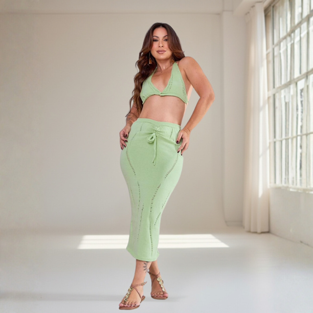 Conjunto Saia + Cropped Tricot Feminino Moda Elegante Verão Premium