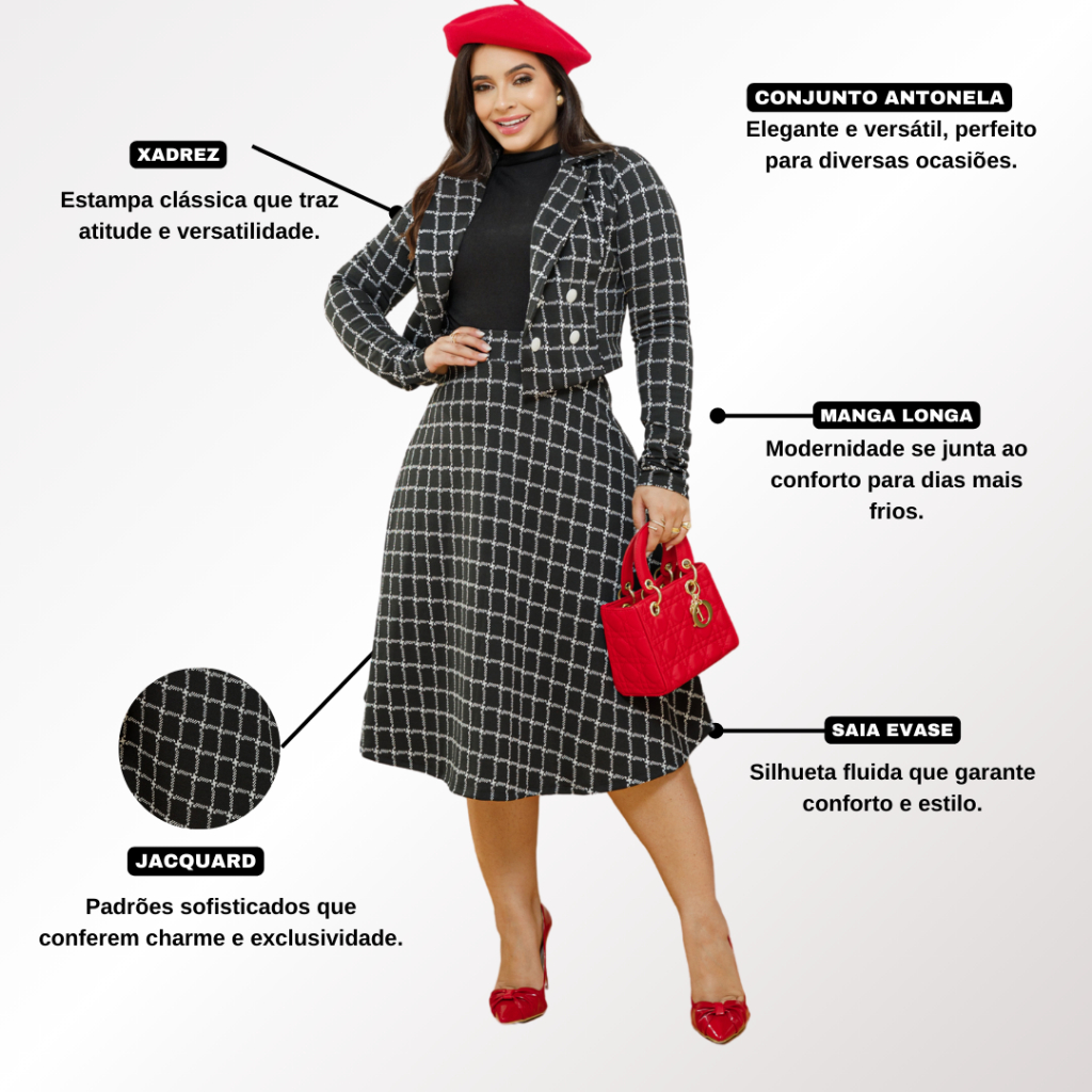 Conjunto Saia Midi Godê E Blazer Com Botões Moda Evangélica REF: ANTONELLA -Tecido: Malha Crepe -Botões não funcionais -Não amassa -Tamanho: P:38/40 M:40/42 G:42/44 GG:44/46 -Produto Novo de Alta Qualidade Um conjunto elegante para o inverno composto por uma saia midi estilo Godê e um blazer sofisticado com botões. A saia midi tem um caimento fluido e volumoso, destacando a cintura e proporcionando movimento ao caminhar. Feita de tecido mais encorpado e quente, em malha crepe, a saia é ideal para os dias frios, mantendo o conforto sem perder a feminilidade. O blazer complementa o visual com um design estruturado, botões frontais e mangas longas, adicionando sofisticação e aquecendo nos dias mais frios. O conjunto é ideal para eventos formais ou mesmo para um look mais refinado no trabalho, podendo ser combinado com botas de cano alto ou sapatos fechados.