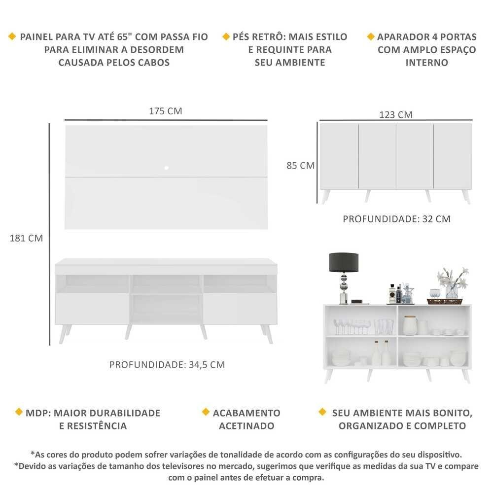 Conjunto Sala de Estar Rack + Painel TV 65" e Aparador Retrô Sofia Multimóveis Branco