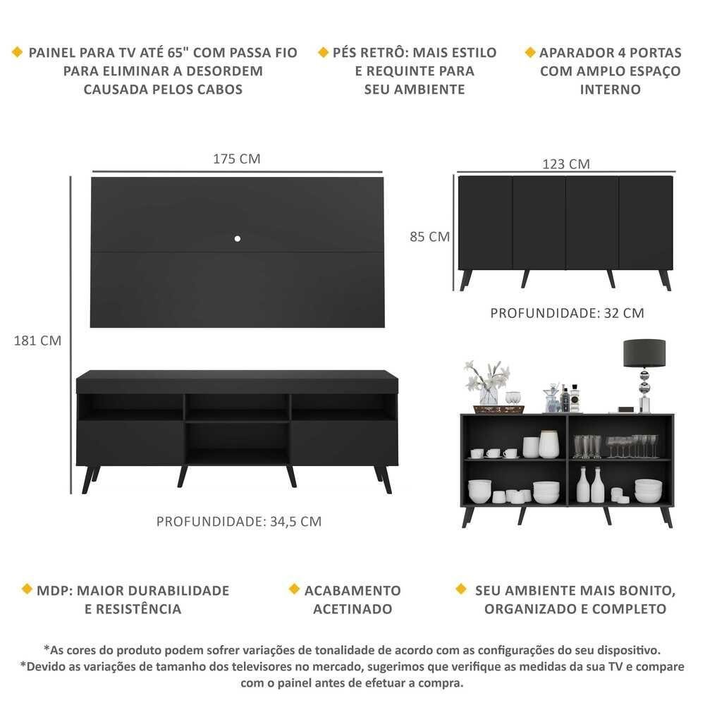 Conjunto Sala de Estar Rack + Painel TV 65" e Aparador Retrô Sofia Multimóveis Preto