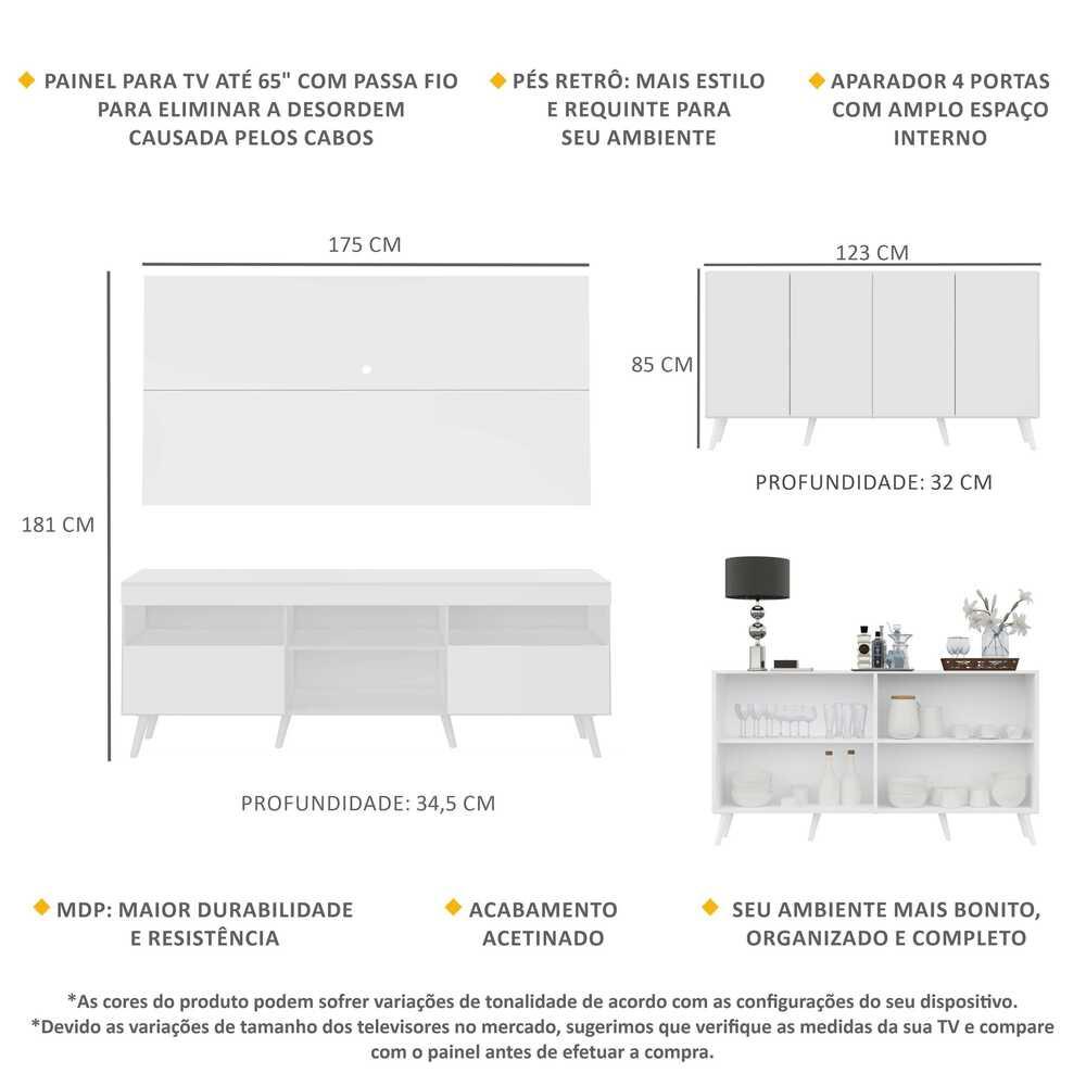 O Conjunto Sala de Estar Rack + Painel TV 65" e Aparador Retrô Sofia Multimóveis é uma escolha inteligente e super em conta para deixar o seu ambiente bonito e completo. Produzido em MDP com acabamento acetinado (cerca de 20% de brilho), que garante maior durabilidade, resistência e facilidade na limpeza, possui painel para TV de até 65” (suporta até 30 Kg) com espaçamento para a passagem dos fios, o que deixa um visual clean e os cabos organizados. O rack com 2 portas conta com nichos para acomodar os equipamentos eletrônicos. O aparador com 4 portas, possui um excelente espaço interno para organizar seus pertences (as prateleiras internas suportam 5 Kg cada e o tampo 10 Kg). Conteúdo da Embalagem: 1 (um) rack com painel para TV 1 (um) aparador 4 portas Dimensões do produto montado: Painel TV - Altura: 90 cm | Largura: 175 cm | Profundidade: 2,5 cm Rack - Altura: 64cm | Largura: 175cm | Profundidade: 34,5cm Aparador - Altura: 69,5cm | Largura: 123cm | Profundidade: 32cm *Devido as variações de tamanho dos televisores no mercado, sugerimos que verifique as medidas da sua TV e compare com o painel antes de efetuar a compra. *Não recomendamos utilizar suporte de TV articulado. *Você pode consultar as medidas internas na imagem técnica do produto. *As cores do produto podem sofrer variações de tonalidade de acordo com as configurações do seu dispositivo. Imagem meramente ilustrativa. Decoração e eletros não acompanham o produto. O produto será entregue desmontado e não disponibilizamos o serviço de montagem.