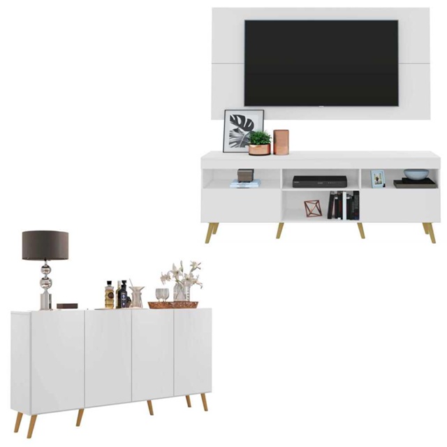 O Conjunto Sala de Estar Rack + Painel TV 65" e Aparador Retrô Sofia Multimóveis é uma escolha inteligente e super em conta para deixar o seu ambiente bonito e completo. Produzido em MDP com acabamento acetinado (cerca de 20% de brilho), que garante maior durabilidade, resistência e facilidade na limpeza, possui painel para TV de até 65” (suporta até 30 Kg) com espaçamento para a passagem dos fios, o que deixa um visual clean e os cabos organizados. O rack com 2 portas conta com nichos para acomodar os equipamentos eletrônicos. O aparador com 4 portas, possui um excelente espaço interno para organizar seus pertences (as prateleiras internas suportam 5 Kg cada e o tampo 10 Kg). Conteúdo da Embalagem: 1 (um) rack com painel para TV 1 (um) aparador 4 portas Dimensões do produto montado: Painel TV - Altura: 90 cm | Largura: 175 cm | Profundidade: 2,5 cm Rack - Altura: 64cm | Largura: 175cm | Profundidade: 34,5cm Aparador - Altura: 69,5cm | Largura: 123cm | Profundidade: 32cm *Devido as variações de tamanho dos televisores no mercado, sugerimos que verifique as medidas da sua TV e compare com o painel antes de efetuar a compra. *Não recomendamos utilizar suporte de TV articulado. *Você pode consultar as medidas internas na imagem técnica do produto. Disponível nas cores: Preto - Preto/Natural - Preto/Branco - Branco - Branco/Natural - Branco/Preto *As cores do produto podem sofrer variações de tonalidade de acordo com as configurações do seu dispositivo. Imagem meramente ilustrativa. Decoração e eletros não acompanham o produto. Produto NOVO - acompanha nota fiscal, manual de montagem e certificado de garantia. O produto será entregue desmontado e a Multimóveis não disponibiliza o serviço de montagem.