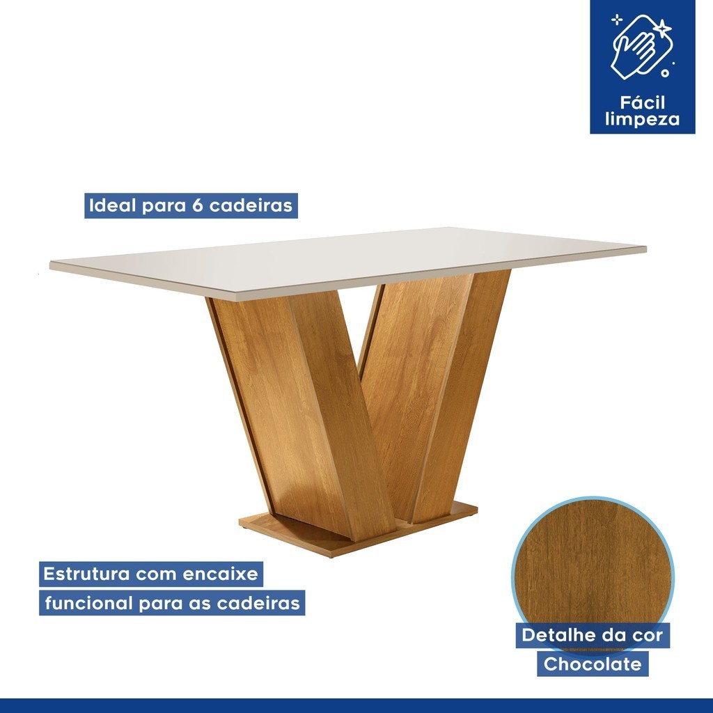 Se você planeja completar a sua casa com bom gosto e charme, então, nosso conjunto de mesa de jantar com 6 cadeiras é o ideal. A mesa com tampo de vidro dá um toque sofisticado e facilita na limpeza, enquanto as cadeiras garantem o conforto para longos momentos especiais. O conjunto de mesa com base em V é uma excelente forma de começar a decoração, não é mesmo? .A mesa de jantar quadrada é segura? Claro, segura e funcional. .Pode usá-la em outro ambiente? Sim, também é ideal como conjunto de mesa com cadeiras para cozinha e para dar um Up na decoração de sala de estar. Estilo: Moderno Formato: Retangular Garantia: 03 Meses Altura (cm): 80 Largura (cm): 120 Cor da Base: Ypê Cor do Tampo: Off White Peso da Mesa: 43 Possui Vidro: Sim Mesa Dobrável: Não Cor Secundária: Marrom Design da Base: Em V Mesa Extensível: Não Profundidade (cm): 80 Vidro Temperado: Sim Cor das Cadeiras: Marrom Escala de Brilho: Fosco Formato do Tampo: Retangular Mesa Suporta Até: 40 Material do Tampo: Vidro/MDF Origem do Produto: Nacional Acabamento da Mesa: Pintura UV Ambiente Principal: Sala de Jantar Espessura do Tampo (mm): 22 Espessura do Vidro: 4 Almofada do Assento: Fixa Estrutura do Assento: MDF Estrutura do Encosto: MDF De Canto (Canto Alemão): Não Enchimento do Assento: Espuma D-23 Enchimento do Encosto: Espuma Peso da Cadeira/Banco: 8 Quantidade de Lugares: 6 Cadeira/Banco Estofada: Encosto e Assento Estofados Quantidade de Cadeiras: 6 Configuração do Conjunto: Mesa com Cadeiras Material da Base da Mesa: MDF Possui Apoio para Braços: Não Possui Apoio para os Pés: Não Possui Suporte Giratório: Não Cadeira/Banco Suporta Até: 120 Apoio para Braços Estofado: Não Acabamento da Cadeira/Banco: Pintura UV Revestimento da Cadeira/Banco: Suede Informações Complementares (Novo): Acabamento da cadeira em Pintura UV e dos pés em Melamínico Material da Estrutura da Cadeira: MDF Material Principal das Cadeiras/Bancos: MDF Marca: Yescasa Cor: Ypê/Off White/Tecido Animale Marrom Cor do Produto: Ypê/Off White/Animale Marrom Itens Inclusos: 1 Mesa, 6 Cadeiras e Manual de Montagem. Cor Predominante: Marrom Linha ou Coleção: Espanha Medida da Base (A x L x P): 77,3cm x 89cm x 40cm Medida da Mesa (A x L x P): 79,5cm x 160cm x 80cm Medida do Tampo (L x C x E): 160cm x 80cm x 2,2cm Quantidade do Produto: 6 Medida da Cadeira/Banco (A x L x P): 95cm x 44cm x 56cm