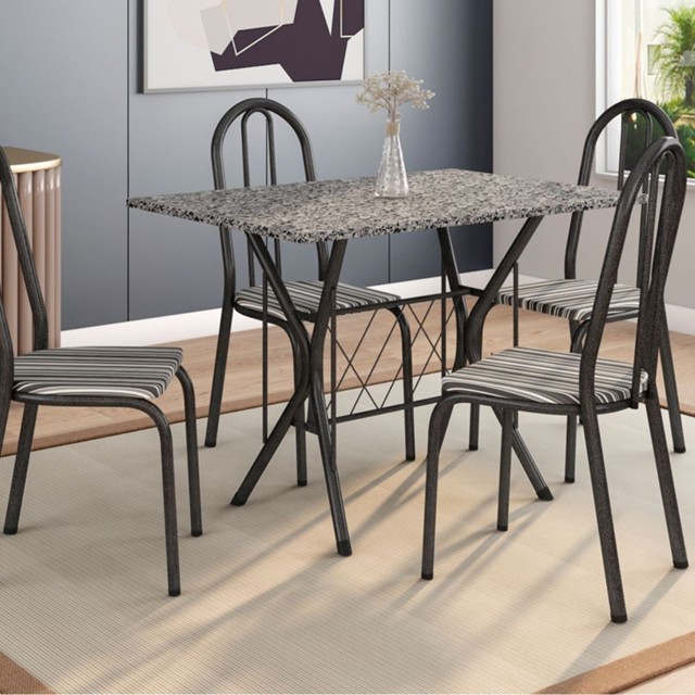 Conjunto Sala de Jantar Mesa Tampo em Granito Retangular 4 Cadeiras Bruna Cromo Preto/Preto Listra