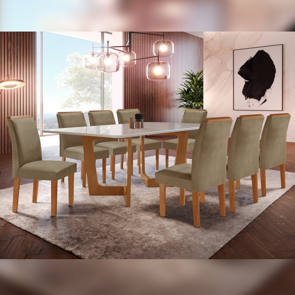 Conjunto Sala de Jantar Nápoles Tampo Vidro/mdf com 8 Cadeiras Luísa Smart Plus Cinamomo/Off White/Areia