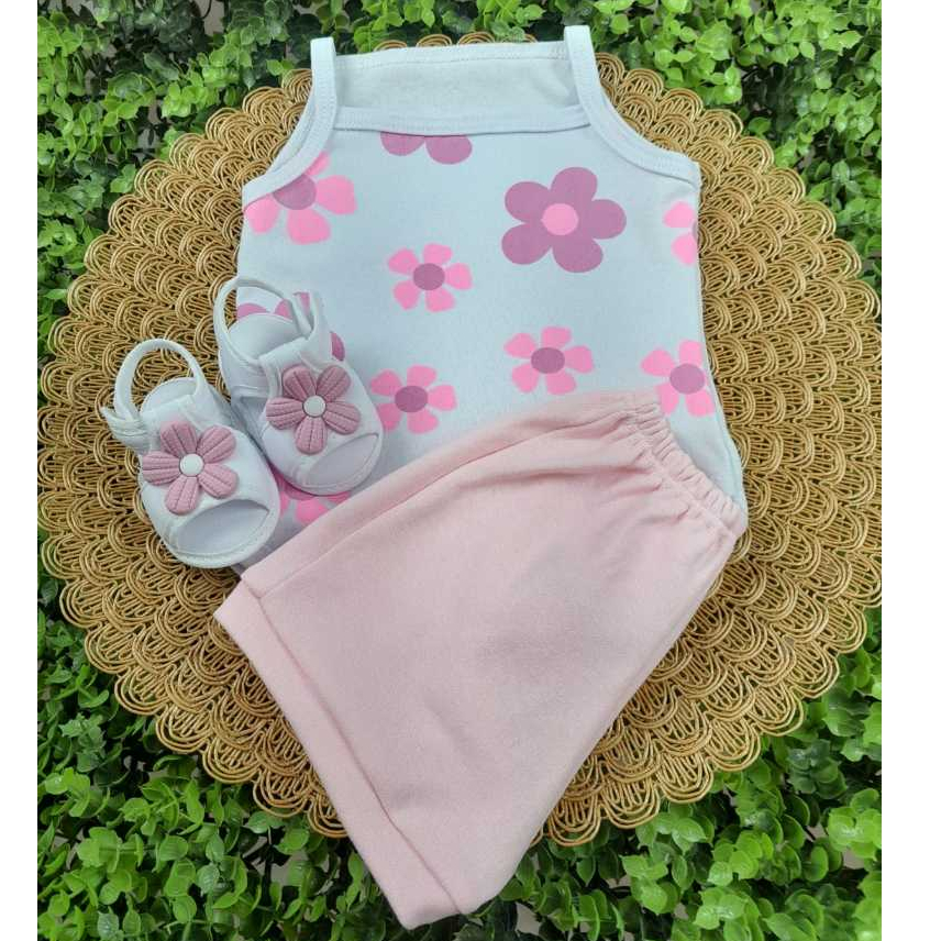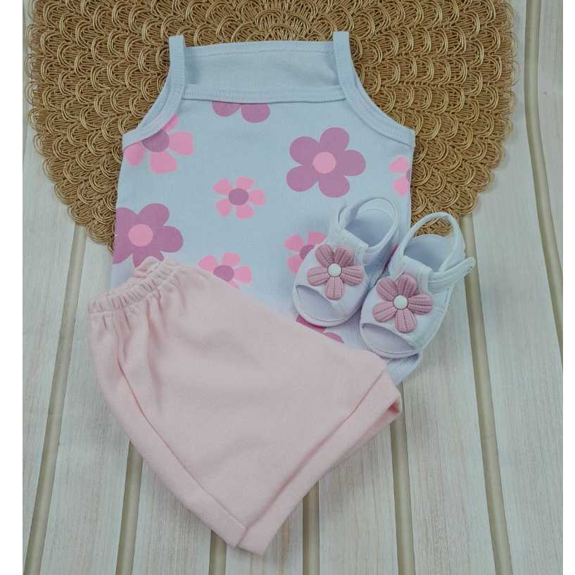 Conjunto Sandália Com Body Flor E Short Bebe Menina Mesversário Estampado Verão 100% Suedine