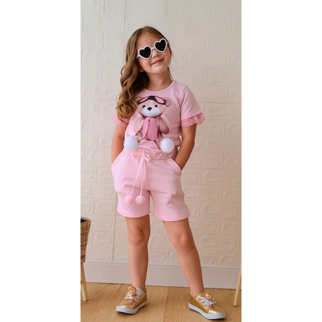 Conjunto Short de Menina Feminino Infantil Ursinho de Verão Shorts e Blusa Com PomPom