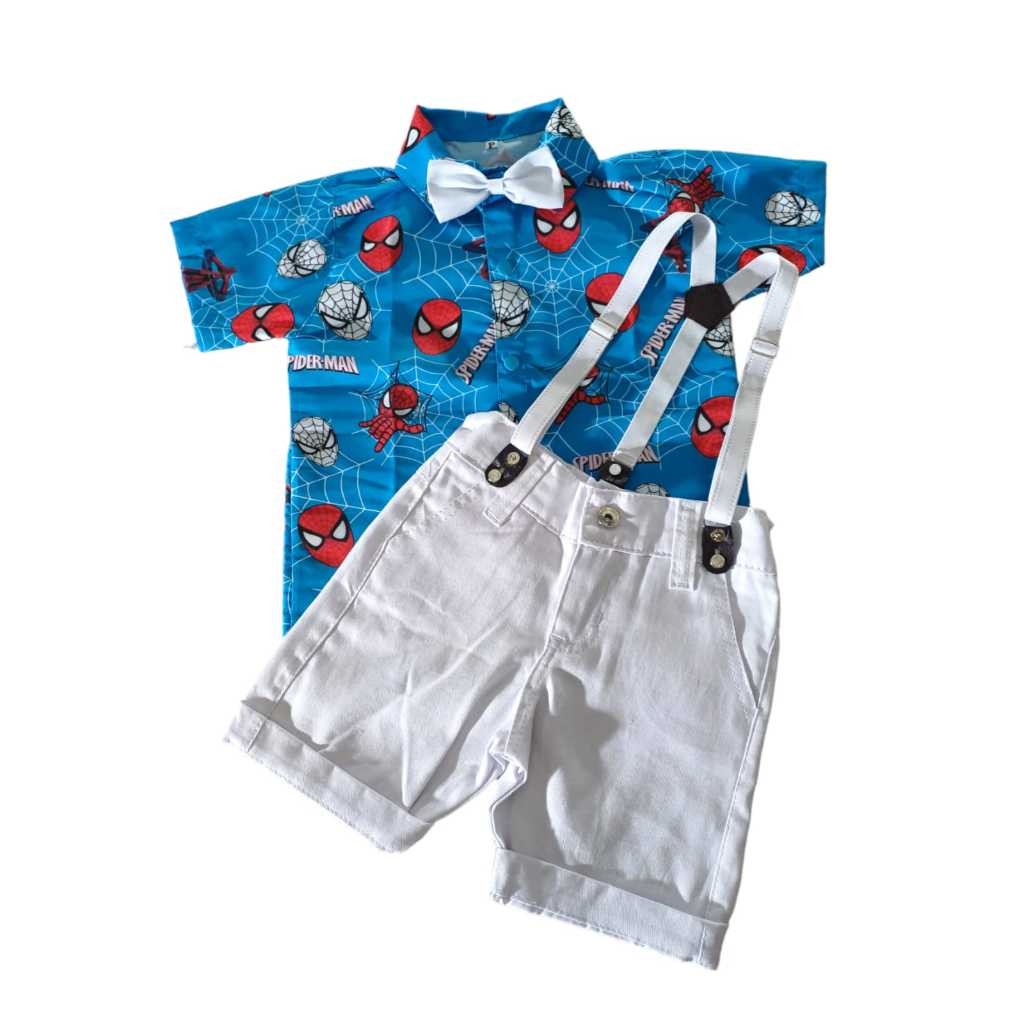 Conjunto Suspensório Temático HOMEM ARANHA Aniversários e Festas. ❤️❤️ACOMPANHA❤️❤️ 😍CAMISA 😍BERMUDA 😍SUSPENSÓRIO 😍GRAVATA. ❤️❤️TAMANHO IDEAL POR PESO❤️❤️ 👉PP: até 10kg 👉1 ano: até 12kg 👉2 anos: até 14kg 👉3 anos: até 17kg 👉4 anos: até 20kg ❤️❤️TAMANHOS❤️❤️ 👉PP - Blusa PP com Bermuda PP _________________________________ 👉1 ano - Blusa P com Bermuda P _________________________________ 👉2 anos -Blusa P com Bermuda M _________________________________ 👉3 anos - Blusa M com Bermuda M _________________________________ 👉4 anos - Blusa G com Bermuda G ❤️❤️MEDIDAS CAMISA MICROFRIBA❤️❤️ 👉PP- 6-11meses-Largura 25,Altura 32,5,Manga 9,5. __________________________________________ 👉P- 1 a 2 anos -Largura 30-Altura 40 Manga 12 __________________________________________ 👉M- 3 anos -Largura 35-Altura 42-Manga 13 __________________________________________ 👉G- 4 anos- Largura 36- Altura 43- Manga13,5. ❤️❤️MEDIDAS BERMUDA BRIM❤️❤️ 👉BERMUDA PP- Largura 24-Altura 29-Coxa 15 ________________________________________ 👉BERMUDA P - Largura 26-Altura 30-Coxa 16 ________________________________________ 👉BERMUDA M- Largura 27-Altura 33 -Coxa 17 ________________________________________ 👉BERMUDA G- Largura 30-Altura 37-Coxa 18 👀ATENÇÃO --> Os produtos podem apresentar pequenas variações de cor e aparência devido flash da câmera fotográfica.