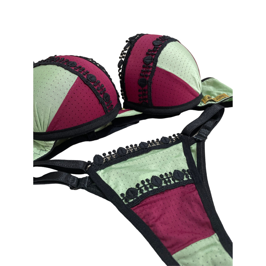 Conjunto de lingerie feminino sofisticado composto por sutiã com bojo e aro e calcinha modelo fio dental. Desenvolvido com tecido microperfurado de alta qualidade, este conjunto combina conforto e sensualidade na medida certa. O design moderno traz uma paleta de cores elegante, com combinação de verde claro e vinho, valorizada por detalhes em renda preta delicada e acabamento em viés preto. O sutiã possui estrutura com bojo firme e aro, oferecendo excelente sustentação e realce ao busto. As alças são ajustáveis, garantindo melhor adaptação ao corpo e conforto no uso diário ou em ocasiões especiais. A calcinha fio dental acompanha o mesmo padrão de cores e acabamento do sutiã, com ajuste lateral e recorte anatômico que valoriza as curvas com discrição e sensualidade. A renda aplicada na parte frontal confere um toque extra de charme e feminilidade. Ideal para mulheres que desejam se sentir poderosas e confiantes, esse conjunto é perfeito para compor o look íntimo com elegância. Pode ser usado tanto no dia a dia quanto em momentos especiais. Produto artesanal de excelente acabamento, fabricado com cuidado e atenção aos detalhes. Disponível em diversos tamanhos.