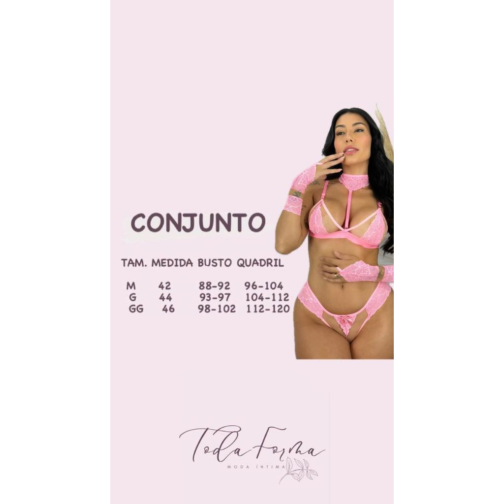 Transforme seus momentos íntimos em uma experiência inesquecível com nosso Conjunto de Lingerie em Renda e Tule, o sutiã sem bojo, alças reguláveis, calcinha de renda, além de uma coleira e luvas para completar o visual, você estará pronta para impressionar. A combinação de renda e tule confere ao conjunto um visual sofisticado e sensual. A renda delicada e o tule transparente se complementam, criando um design elegante e provocante. Modelo veste tamanho > M Cor - As fotos possuem uma leve edição para realçar as cores, podendo apresentar variação de cor, considerando a nitidez de cada celular ou monitor e também a pigmentação de cada fabricante. Renda e Tule - O desenho da renda pode variar de acordo com a disponibilidade e o tule pode variar entre liso e poá. Instrução de lavagem - Esta peça não pode ser lavada em maquina sob nenhuma hipótese, caso contrario por ser delicado, as costuras podem ser danificadas. Desta forma sua peça será melhor conservada. O produto é igual ao da foto? R: Sim! Fotos reais com modelos reais