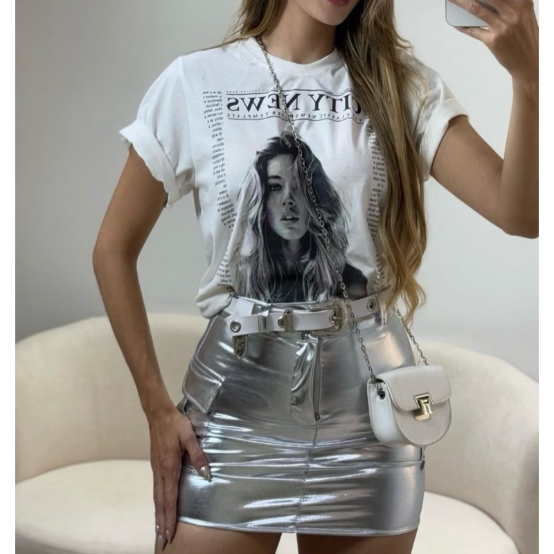 Conjunto T Shirt e Saia Cargo de Vinil Look Balada Festa Tendência