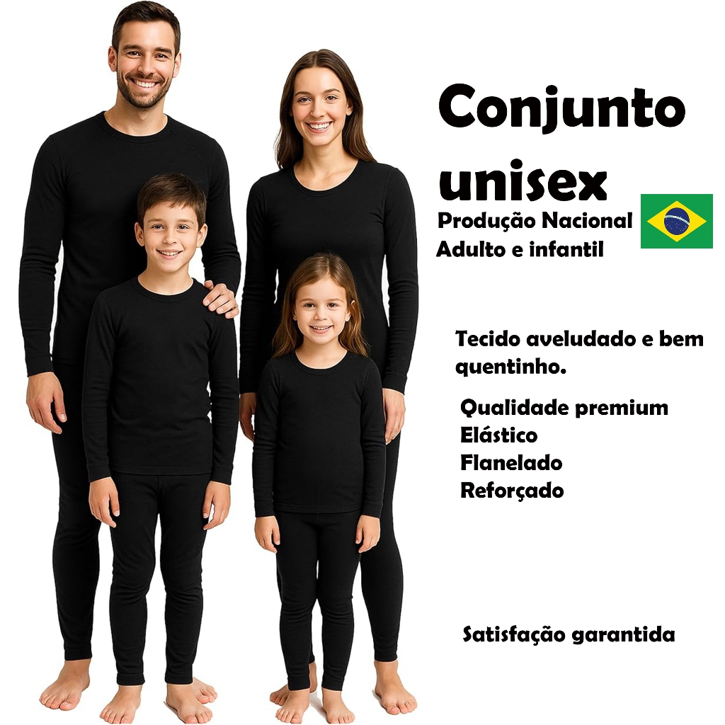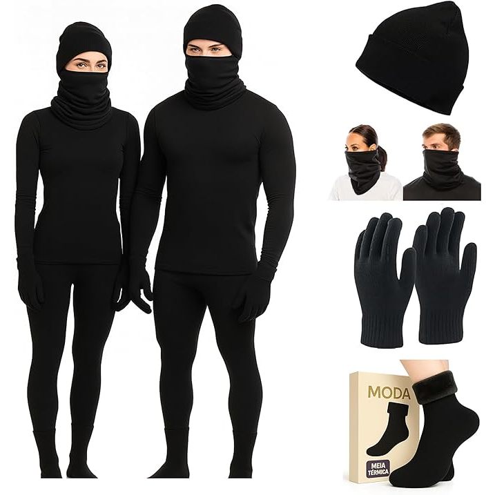 MODELO UNISEX - FABRICADO NO BRASIL, TECIDO PREMIUM, QUALIDADE 100% GARANTIDA Modelo do video : Feminino Medidas: 165 cm peso : 72 kilos - Utiliza Conjunto G Modelo do video : Masculino Medidas: 176 cm peso : 87 kilos - Utiliza Conjunto GG **Caso você goste de um modelo mais folgado, escolha uma numeração maior que esta acostumado a usar CONJUNTO COMPLETO UNISEX: Kit térmico segunda pele unissex incluindo blusa, calça, touca, cachecol, meias e luvas touch screen para uso em smartphones MATERIAL PREMIUM: Confeccionado em malha térmica peluciada aveludada de SUPLEX, oferecendo isolamento térmico e conforto excepcional DESIGN VERSÁTIL: Gola alta protetora, manga longa e ajuste segunda pele que se adapta perfeitamente ao corpo CARACTERÍSTICAS: Tecido macio e elástico, ideal para temperaturas baixas, disponível em preto com acabamento sólido CUIDADOS: Lavável à máquina com água fria, secar na sombra, não usar alvejante, não passar a ferro para maior durabilidade Modelo do video : Feminino Medidas: 165 cm peso : 72 kilos - Utiliza Conjunto G Modelo do video : Masculino Medidas: 176 cm peso : 87 kilos - Utiliza Conjunto GG