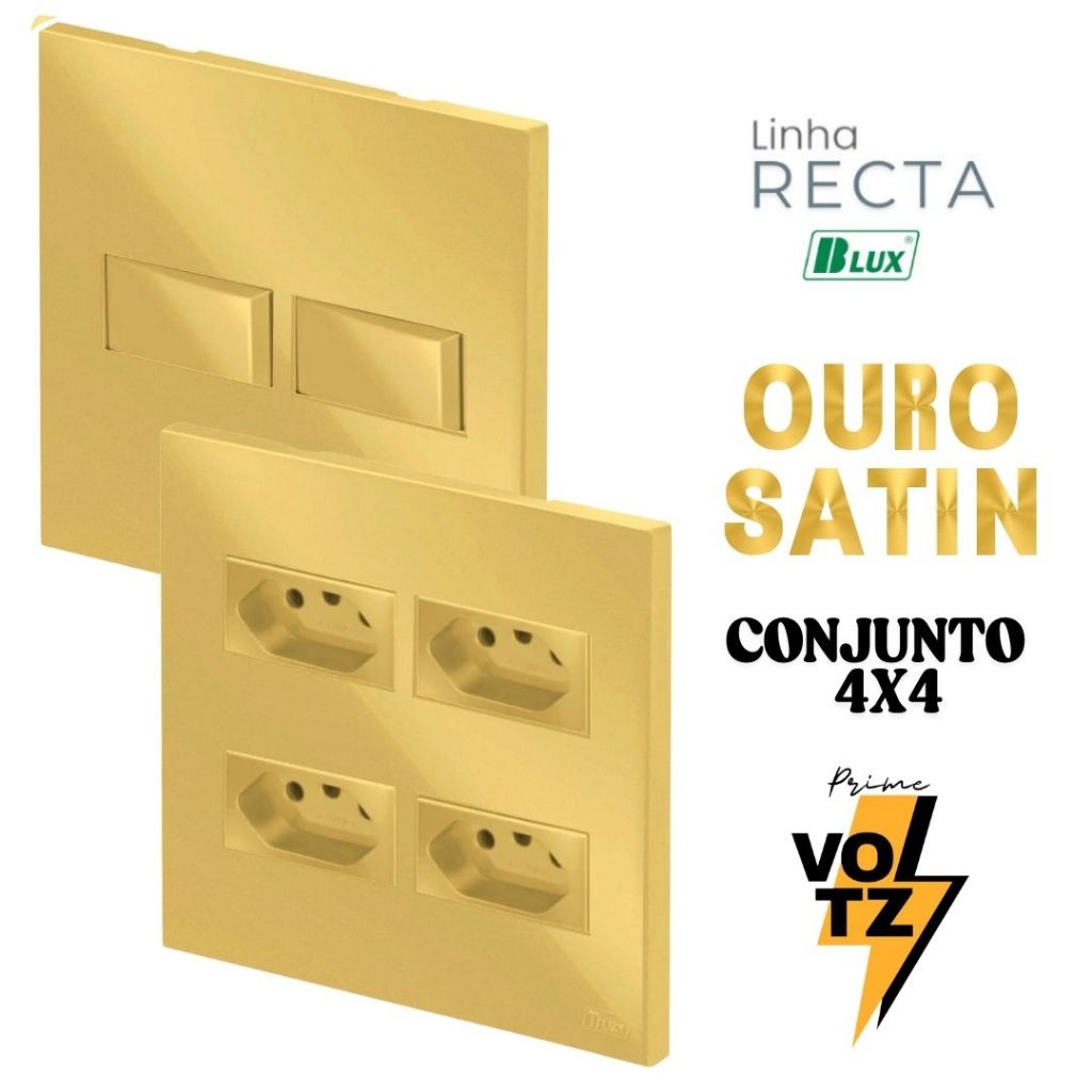 Conjunto Tomada Dourada Ouro Nobre 4x4 10a 20a Interruptor Simples Paralelo Recta Satin Fosco BLUX