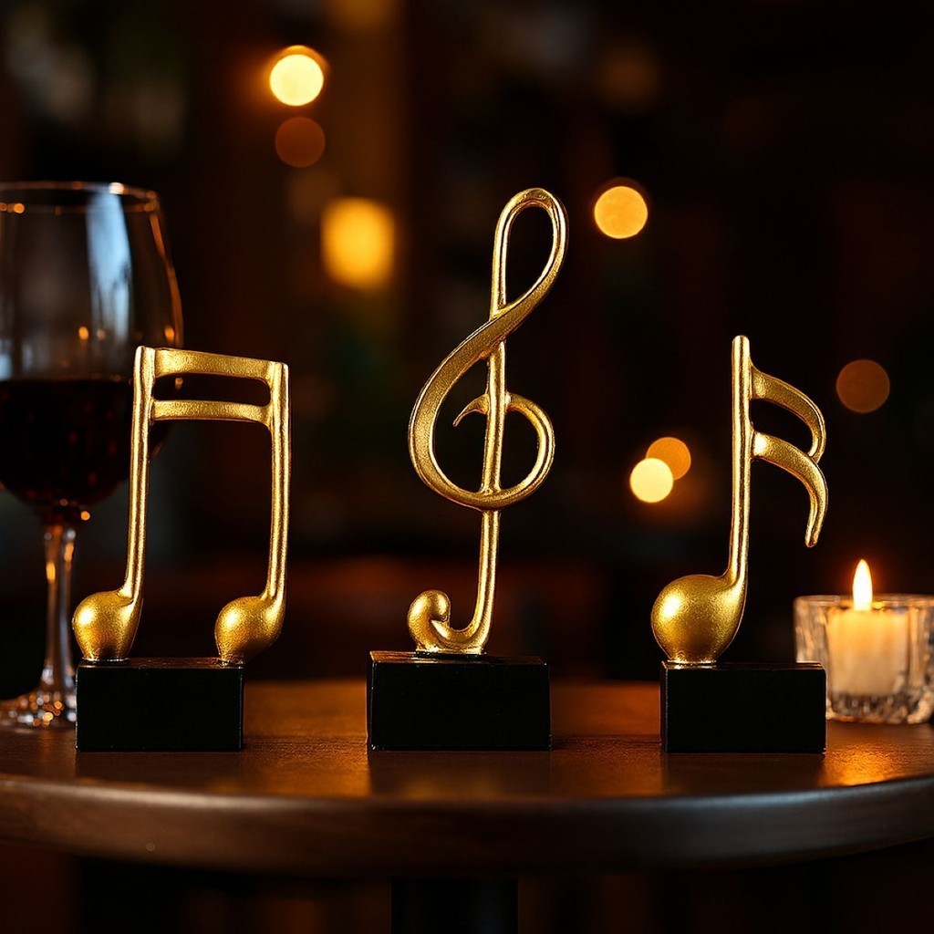 Conjunto Trio Enfeite Nota Musical em Resina Dourada Decoração Moderna e Presente Criativo
