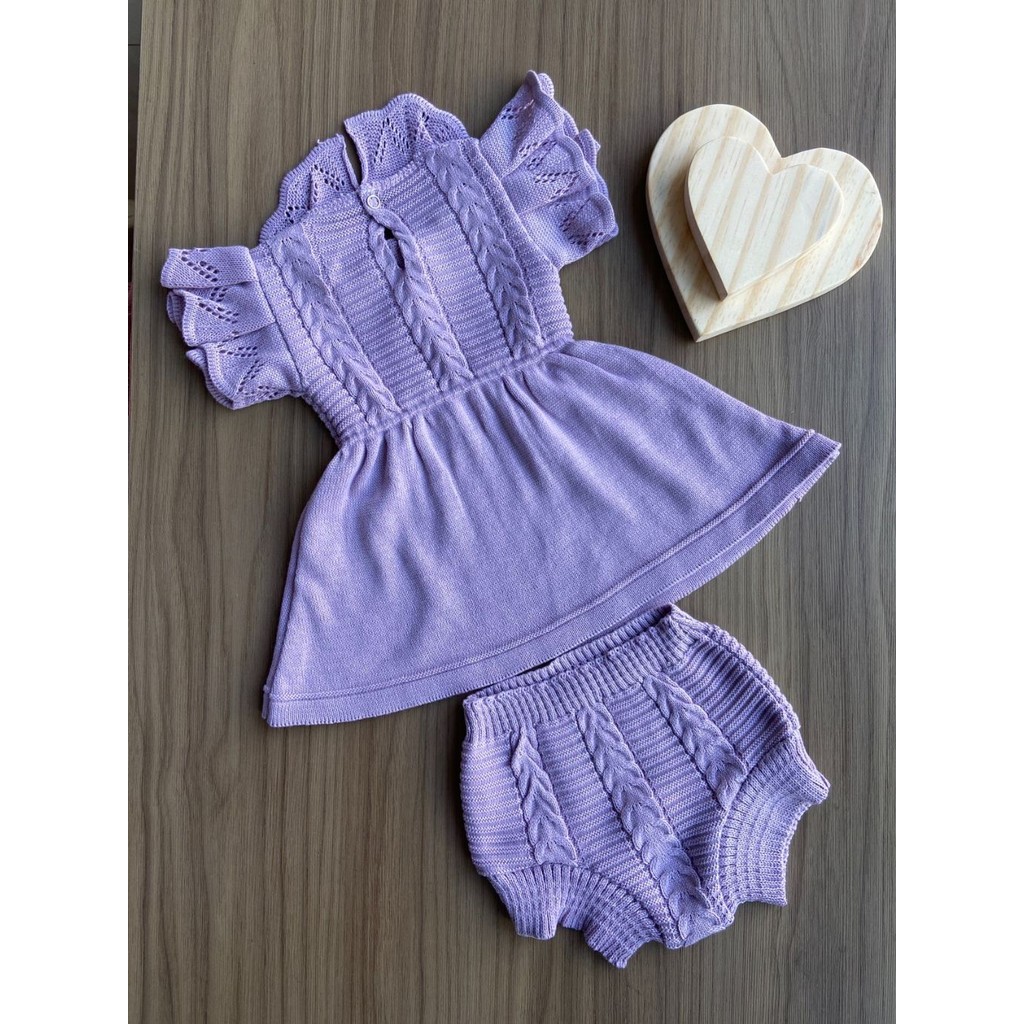 Conjunto Vestido Calcinha Bebê RN Infantil Récem Nascido Menina Tricô Tricot