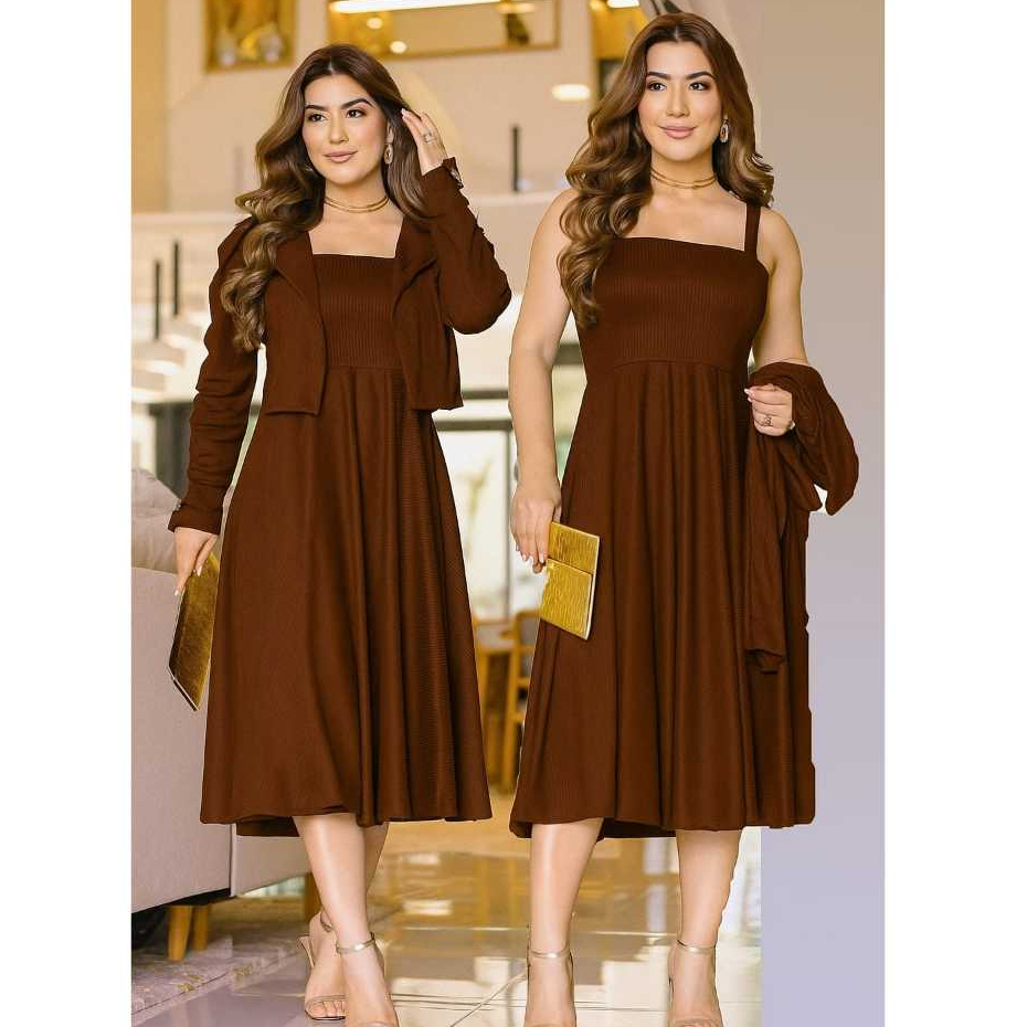 Conjunto Vestido Rodado Midi + Casaco Blazer Moda Evangélica executiva Elegante