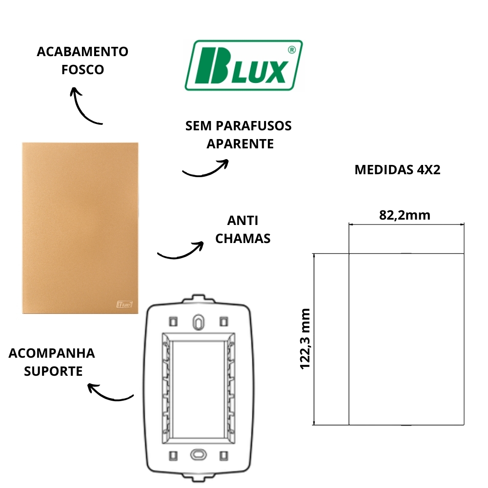 -REVENDEDOR AUTORIZADO BLUX. -PRODUTOS ORIGINAIS. -PRODUTOS ENVIADOS COM NOTA FISCAL. -ENVIO EM ATÉ 24H UTEIS **ATENÇÃO MONTE O SEU KIT ADICIONANDO OS MODELOS DESEJADOS AO CARRINHO** Apresentamos a linha de tomadas acetinada Recta Satin Chocolate design moderno, destacando-se pelos cantos retos que conferem um visual elegante. Fabricadas com materiais de alta qualidade, estas tomadas não apenas oferecem um acabamento sofisticado que complementa qualquer ambiente, mas também garantem durabilidade e funcionalidade. O acabamento fosco acetinado proporciona uma estética minimalista e discreta. Perfeitas para residências e espaços comerciais que valorizam o estilo moderno aliado à praticidade e confiabilidade. Sistema modular, compatível apenas com os módulos da linha RECTA SATIN OURO NOBRE Dimensões do produto PLACA 4x2 - 122,3 x 82,2 x 42,3 mm PLACA 4x4 - 122,3 x 122,3 x 42,3 mm LINHA RECTA SATIN * SELO DO INMETRO * NÃO RETÉM POEIRA * ENCAIXE DOS MÓDULOS PERFEITO * ACABAMENTO DA PLACA CANTOS RETO * LIMPEZA FÁCIL * ÚNICO MÓDULOS COM 4 ENTRADAS PARA FIOS E CABOS INDEPENDENTES EM CADA BORNE ** Perguntas frequentes sobre o produto ** • Acompanha suporte ? Sim, os suportes são enviados fixados junto com as placas. • Posso usar em 127v ou 220v? Sim, a tensão máxima suportada é 250v. • O que é 10A e 20A? 10A significa 10 Ampères, ou seja, a correnta máxima que a tomada suporta. Vale lembra que as tomadas 10A tem seu plug mais fino e a de 20A seu plug mais grosso. Isso para suportar os equipamentos de maior potência. • Montam um anuncio com os itens que preciso? Sim, montamos kits com itens acima de 10 peças. Ficou com duvidas? Nos chame no campo de perguntas, estamos sempre à disposição para melhor atendê-lo.