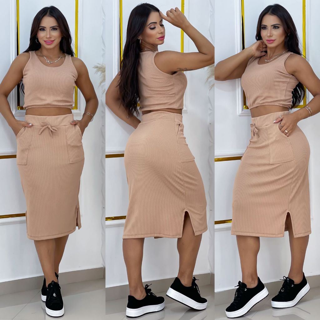 conjunto croopd saia tecido canelado anaruga saia com fenda na lateral e bolso crooped regata TAMANHOS M,G,GG Nossas peças são altamente selecionadas e revisadas, peças de excelente qualidade cores lindas disponíveis ENVIO EM ATÉ 24HORAS APÓS A CONFIRMAÇÃO DO PAGAMENTO Qualquer duvida estamos a disposição no chat