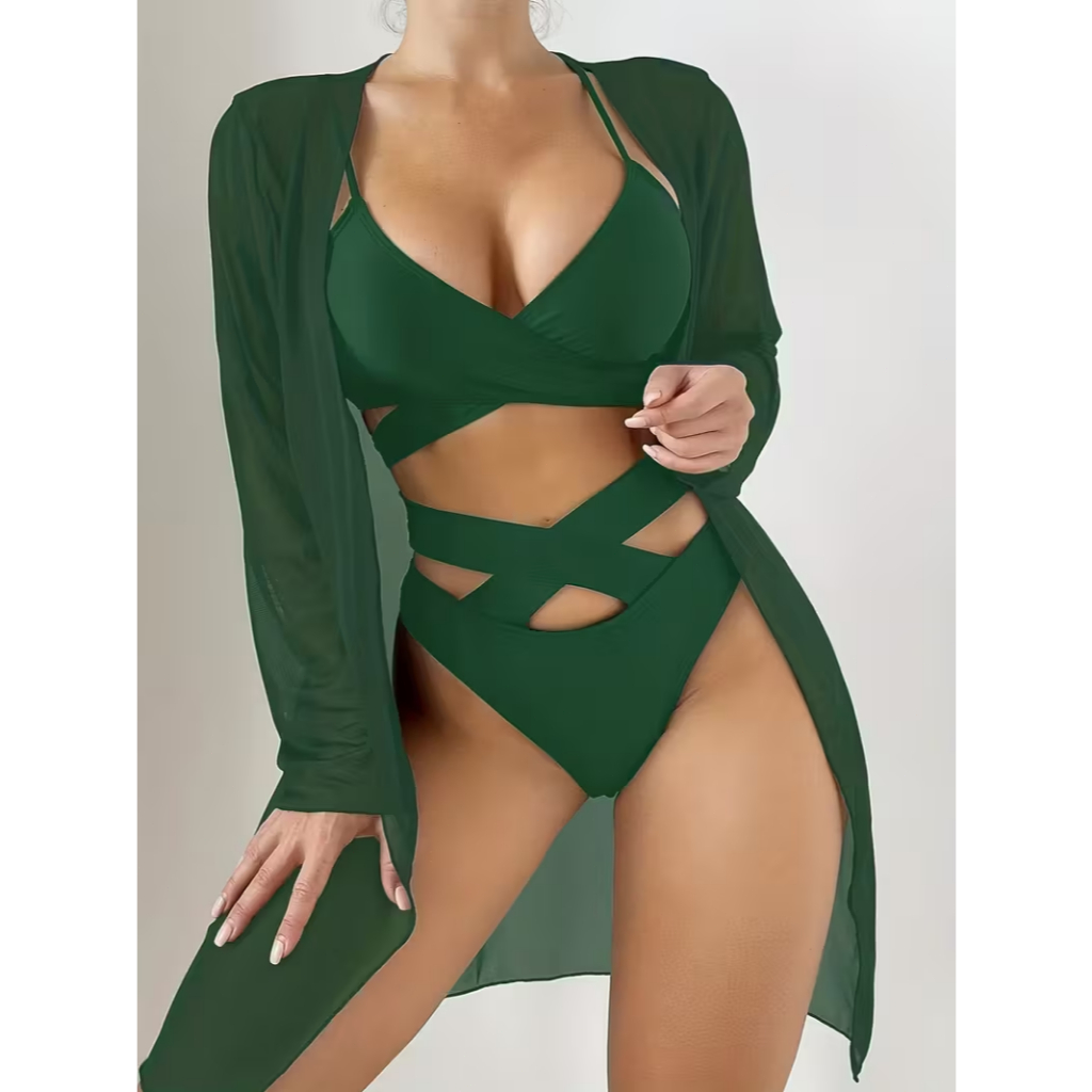 Conjuntos de biquíni com decote em V de 3 peças, alças cruzadas e corte alto com camisa para cobrir, maiô de manga compr