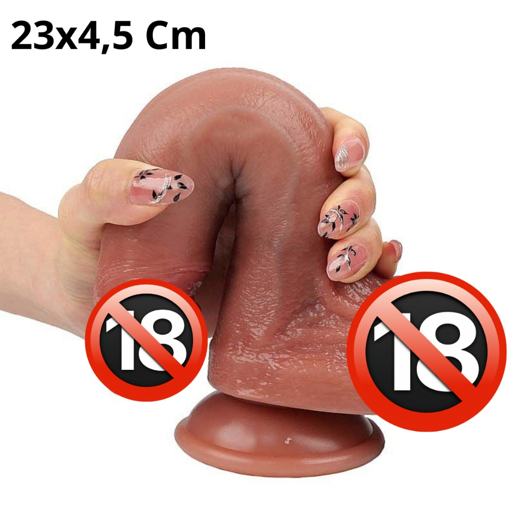 Prótese realística em forma de pênis, confeccionado em silicine possui glande definida, textura de veias, escroto e ventosa para penetrações em ângulo reto. Modo de uso: Lubrificar antes da penetração. Para uso anal ou vaginal. Material: Silicone Líquido Medidas: 23,0 cm de comprimento, 4,5 cm de espessura (medidas aproximadas). Higienização: Lavar com água e sabão neutro antes e após o uso. Depois seque com papel toalha ou deixe secar naturalmente. Depois de seco guarde seu vibrador na embalagem original. Não compartilhar e não expor a temperatura superior a 50°C. Cuidados: Higienize sempre antes e após o uso; Não compartilha; Mantenha fora do alcance de crianças; Manter ao abrigo do calor e luz excessiva;