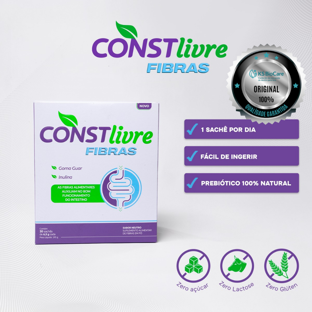 Equilíbrio intestinal, conforto e bem-estar diário O Constlivre, produzido pela Canonne, é um suplemento alimentar formulado com fibras solúveis de alta qualidade — Inulina e Goma Guar — que auxiliam no bom funcionamento intestinal e promovem o equilíbrio natural da flora digestiva. Seu uso diário favorece a regularidade intestinal, alivia a constipação e melhora a digestão, proporcionando mais leveza, conforto e bem-estar de forma natural e segura. Benefícios principais: Regula o trânsito intestinal de forma natural Favorece o equilíbrio da microbiota intestinal Melhora a digestão e absorção de nutrientes Contribui para o bem-estar e sensação de leveza Auxilia na manutenção de uma rotina intestinal saudável Composição e ação dos ingredientes: Inulina: Fibra prebiótica que estimula o crescimento de bactérias benéficas no intestino (como bifidobactérias e lactobacilos), auxiliando no equilíbrio da flora intestinal e na melhora da absorção de minerais. Goma Guar:Fibra solúvel que absorve água, formando um gel natural que facilita o trânsito intestinal e melhora o volume e consistência das fezes, ajudando a aliviar a constipação. Fibras alimentares totais: Contribuem para o bom funcionamento do trato digestivo, o controle do colesterol e o equilíbrio metabólico, promovendo saúde intestinal de forma completa. Modo de uso: Consumir 1 sachê ao dia, diluído em 200 ml de água, suco ou bebida de sua preferência. Indicação: Indicado para quem deseja melhorar o funcionamento intestinal, aliviar a constipação e manter o equilíbrio digestivo com praticidade e conforto. Ideal para quem tem rotina corrida, alimentação pobre em fibras ou busca bem-estar natural diário. Informações adicionais: Não contém glúten Sem açúcares adicionados Prático: 1 sachê ao dia Fabricado por: Canonne Distribuído por: KS BioCare – Cuidando da sua saúde de dentro para fora