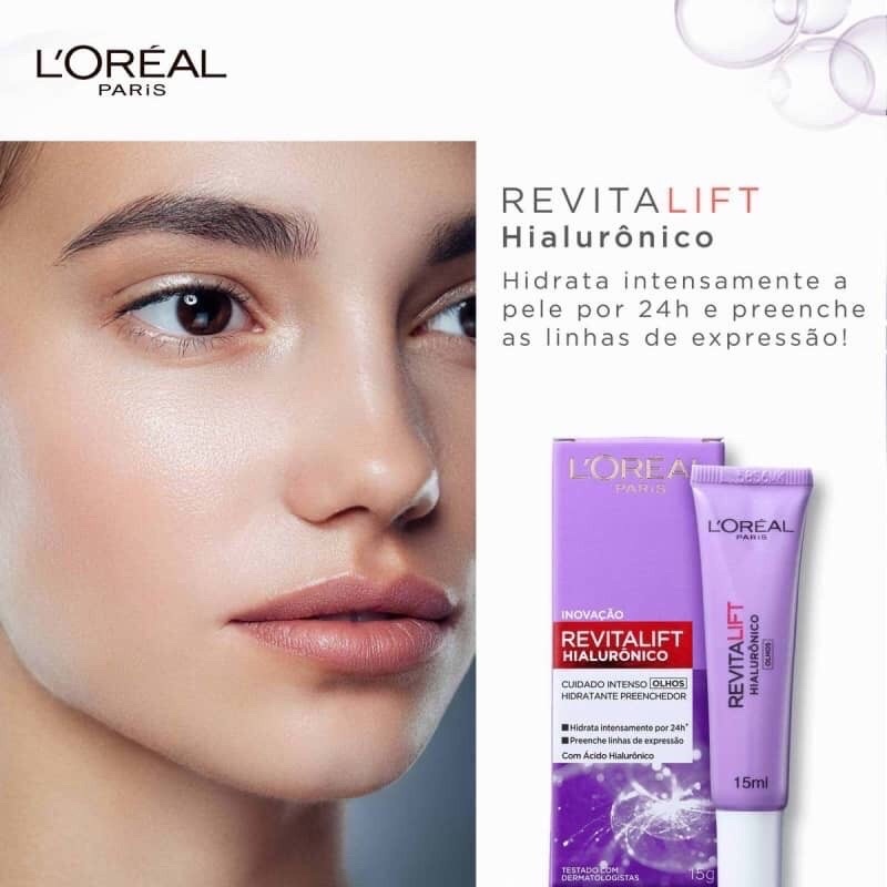 Contorno Dos Olhos Revitalift Hialurônico Loréal Paris 15g - 1 Unidade L’Oréal Paris traz a uma rotina completa para combater essas primeiras linhas de expressão com o Creme para o contorno dos olhos, pois ele cuida especialmente desta área que é mais delicada e sensível. Possui textura leve e é rapidamente absorvida. Sua fórmula age através do poder de hidratação profunda do ácido hialurônico para preencher os vincos que surgem com o tempo ao redor dos olhos, além de iluminar a região, deixar a pele macia e tonificada. Possui Ácido Hialurônico: um ingrediente naturalmente presente na pele, responsável pela hidratação. Sua produção decai ao longo dos anos, dando lugar às linhas de expressão, atrai a umidade do ar para a pele e garante uma hidratação profunda que acaba por preencher as áreas mais flácidas, com os indesejados “pés de galinha”. Benefícios: - Com Ácido Hialurônico Puro - Hidratação intensa por 24h+ - Preenche Linhas de Expressão Modo de Uso: - Sobre a pele limpa e hidratada, pegue uma gotinha de produto entre os dedos anelares e aplique na região dos olhos. Massageie suavemente desde a região das bolsas até a pálpebra. - Use sempre a ponta mais gordinha do dedo anelar para massagear a região dos olhos. Ela possui o tamanho certo e proporciona uma massagem na medida ideal, sem muita força. Resultado: - Nas primeiras 4 semanas, as linhas de expressão diminuem 24% e a pele está nitidamente mais tonificada.