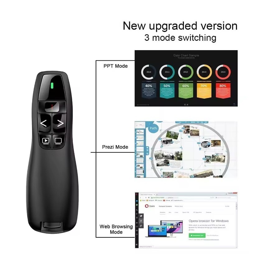 Conduza suas apresentações com muito mais profissionalismo, precisão e liberdade de movimento com o Apresentador Sem Fio. Equipado com tecnologia 2.4GHz, ele oferece conexão estável e rápida em um alcance de até 100 metros, ideal para palestras, salas de aula, conferências e reuniões. Com design ergonômico e ponteiro laser integrado, é a ferramenta essencial para quem busca praticidade e eficiência ao apresentar. ✓ Conexão sem fio 2.4GHz – controle preciso com alcance de até 100m ✓ Compatível com Windows, Mac OS, Linux e Android ✓ Funções completas: avançar, voltar, iniciar/apagar tela e controle de slides ✓ Ponteiro laser vermelho para destacar pontos importantes na tela ✓ Modo múltiplo: PowerPoint, Prezi e navegação web ✓ Design ergonômico e leve, com teclas de fácil acesso ✓ Plug & Play – não requer instalação de drivers ✓ Receptor USB embutido para armazenamento prático ✓ Indicador de bateria e baixo consumo de energia Especificações Técnicas: Conectividade: Wireless 2.4GHz Compatibilidade: Windows, Mac OS, Linux, Android Distância de operação: até 100m Funções: avançar, voltar, tela preta, iniciar/apresentar, ponteiro laser Alimentação: 1 pilha AAA (não inclusa) Receptor USB: Plug & Play (sem necessidade de driver) Cor: Preto Peso: aprox. 32g Dimensões: 120mm x 37mm x 25mm Conteúdo da Embalagem: 1x Apresentador Sem Fio 1x Receptor USB 1x Manual do Usuário