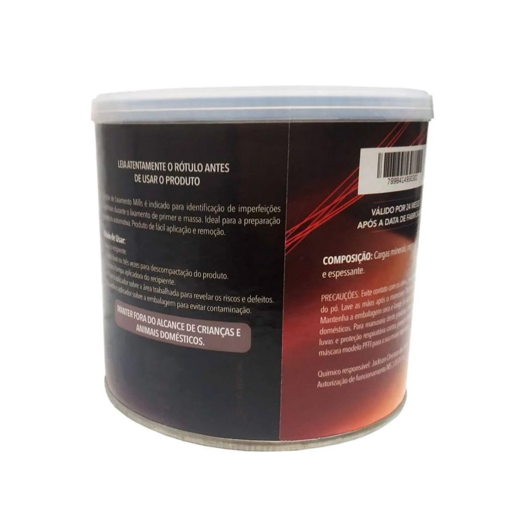 Controle de lixamento 100g - mills Produto em pó para um acabamento perfeito, rápido e fácil de aplicar. Proporciona um lixamento mais uniforme, evitando a necessidade de aplicações de fundo.Auxilia no processo de lixamento do primer e massa poliéster, pois identifica as áreas mais altas a serem lixadas para nivelamento da superfície. Melhora a qualidade do lixamento evitando mapeamento da pintura e riscos posteriores embaixo da tinta.