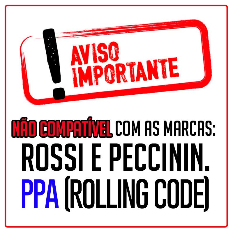 ATENÇÃO ! Não funciona em motores Rossi e Peccinin Não funciona em PPA (JETFLEX / LEGERO / TRIFLEX) Os demais PPA funcionam perfeitamente. Se tiver duvidas se funciona no seu motor verifique se ele trabalha na (Frequência 433,92Mhz Padrão Code Learning ) ou nos consulte no chat, respondemos rapidamente. CARACTERÍSTICAS -Três canais independentes. -Padrão Code Learning. -Teclas de silicone -Led indicador -Frequência 433,92Mhz com cristal SAW, não perde calibração -Formato anatômico. Não permite acionamento acidental quando está no bolso. ATENÇÃO ! Não funciona em motores Rossi e Peccinin Não funciona em PPA (JETFLEX / LEGERO / TRIFLEX) Os demais PPA funcionam perfeitamente.
