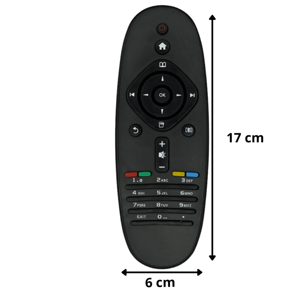 Se o seu Controle Remoto para TV Philips original quebrou não se preocupe, pois temos a solução. O Controle Remoto para TV Philips fabricado pela SKY foi desenvolvido com material de alta qualidade (teclas macias, plástico resistente e um led transmissor com excelente tempo de resposta) oferecendo a mesma qualidade e utilidade de ter um controle original em mãos. Informações do Produto: Modelos compatíveis: 32PFL5615D 32PFL6615D 40PFL5615D 40PFL6615D 40PFL8605D 46PFL5615D 46PFL6615D 52PFL8605D 58PFL9955D Composição: Plástico e Teclas de borracha Dimensão: 6 cm X 17 cm Alimentação: 2 Pilhas AAA 1.5V Cor: Preto Embalagem: Unitário - Pilhas não Incluído Fabricante: Produto Importado (Genérico / Paralelo) Não precisa programação, apenas colocar as pilhas e usar. Verificar a compatibilidade do seu aparelho Este produto é uma peça de reposição. Seu controle remoto original deve ser exatamente igual ao exibido na foto. Certifique-se de que esteja adquirindo o modelo correto.