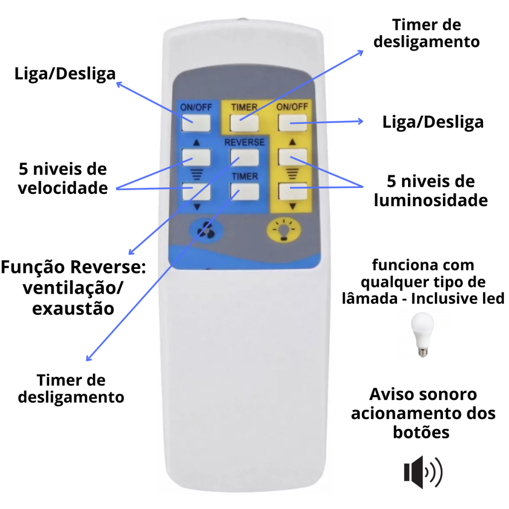 CONTROLE REMOTO PARA VENTILADOR DE TETO E LÂMPADA - Acende qualquer tipo de lâmpada (inclusive de Led) - Aciona a lâmpada pelo interruptor da parede ou pelo controle - Fácil de instalar!! Não precisa passar fios pela sua parede BIVOLT - Lâmpadas até 150W/127V ou 250W/220V - Motor até 1/4 HP ou 150W/127V ou 250W/220V + FACILIDADE - Permite ligar a lâmpada pelo interruptor na parede OU pelo controle remoto LÂMPADA - Timer de desligamento - Dimmer com 5 níveis de controle de luminosidade - Função liga/desliga - Funciona para qualquer tipo de lâmpada*, inclusive de Led *Lâmpadas fluorescentes, eletrônicas e leds comuns não podem ser dimerizadas, vide solução no seletor de lâmpadas de receptor VENTILADOR - Timer de desligamento - Ventilador com dimmer com 5 níveis de velocidade - Função liga/desliga - Função Reverse (ventilação/exaustão) - Aviso sonoro de acionamento dos botões CONTÉM: - Manual de instruções com esquema de instalação - Receptor - Controle remoto - Rabicho GARANTIA: 1 ANO - Contra defeitos de fabricação, desde que corretamente instalado e utilizado. ************UTILIZA 2 PILHAS AAA (não inclusas)************