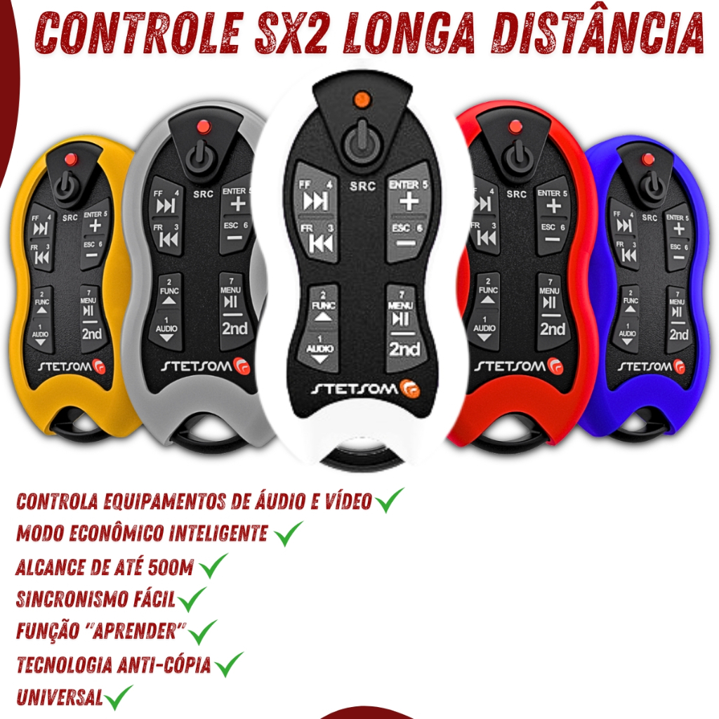 Caracteristicas Marca: Stetsom Modelo: Sx2 Para quem achava que o mercado de controles de longa distancia ja estava definido, nao esperava por este incrivel controle da Stetsom. Com o intuito de trazer mais praticidade nos controles do player, este produto tem como principal funcao permitir ao usuario a navegacao por pastas bem como o total controle de funcoes de video, sendo ideal para player de dvd e centrais multimidia. Com a possibilidade de alcance de 500 metros, este aparelho lhe permite controle a distancia de praticamente todas as funcoes do player. Com design anatomico e capa colorida, o SX-2 se torna uma das melhores opcoes de controles de longa distancia do mercado. Principais Caracteristicas: - Comando para ate 16 Funcoes - Sincronismo com ate 16 Controles (TX2), permitindo que varias pessoas Controlem o mesmo Equipamento - Facil Sincronismo - Alcance de ate 500 Metros de Distancia em Area Aberta (Visada) - Ideal para DVD Players e / ou Kit Multimidia - Equipamento de Audio e Video a Longa Distancia - Indicador de Bateria fraca no Controle e na Central - Contem Varios Modelos de Aparelhos Pre-definidos na Memoria - Possui Varios Modelos de Aparelhos na Memoria alem da "Funcao Aprender" que possibilita a Programacao de Controles do Mercado - Visual Anatomico e Capa Colorida Emborrachada - Resistente a Impacto - Design Moderno - Tecnologia Anti-Copia - Controle com LED Vermelho - Modo Economico Inteligente - Frequencia Central de Transmissao: 433,92 MHZ - Modulacao: FSK - Maxima Potencia de Transmissao: 10mW Controle: - Alimentacao: Bateria CR2032 - 3,0V - Consumo Maximo: 10mA - Dimensoes: 82,7 x 42 x 15,7mm Central: - Alimentacao: 5 a 16V dc - Consumo Maximo: 35Ma - Dimensoes: 57,5 x 33 x 12mm Itens Inclusos: 01 Controle SX-2 16 Funcoes 01 Central Stetsom 01 Cordao de Pescoco 01 Manual de instrucoes 01 Certificado de Garantia