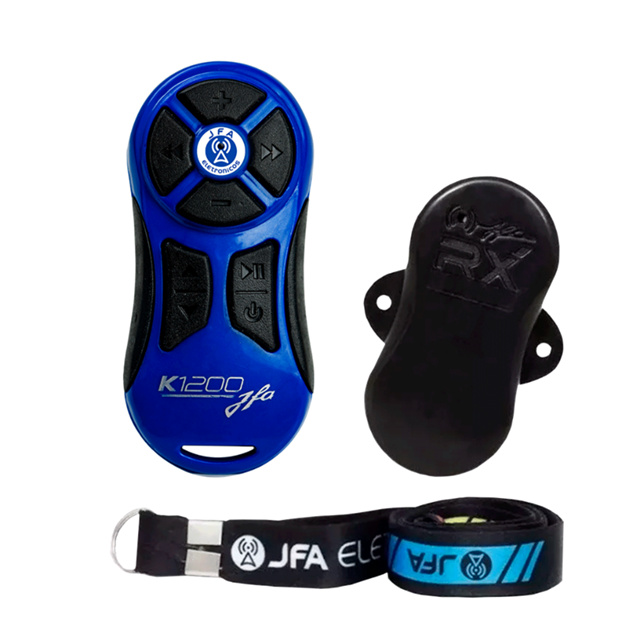 CONTROLE COMPLETO JFA K1200 AZUL Alcance além da vista! O Controle K1200 se destaca por ser o de maior alcance disponível no mercado: 1200 metros de alcance em área aberta. Esta funcionalidade lhe confere o melhor funcionamento em locais como exposições e arenas, onde ocorre maior interferência de sinais RF durante os eventos. Destaques do K1200: Alcance de 1200 metros em área aberta (visada). Design anatômico com excelente ergonomia; Teclas em silicone de alta resistência gravadas a laser; Chassis em ABS com cores exclusivas; Central slim com receptor ultra sensível. Características técnicas TRANSMISSOR: -8 funções definidas podendo ser reconfiguradas (modo aprender); -Teclado em silicone com gravação em baixo relevo; -Chassis em plástico ABS (diversas cores); -Frequência de operação 433,92 MHz; -Alimentação 12V bateria modelo A23. RECEPTOR: -Modo aprender (copia e codifica as funções do controle IR original); -Modo memória (contém em sua memória os principais players do mercado); -Chassis em plástico ABS preto; -Frequência de operação 433,92 MHz; -Alimentação 9 a 16Vdc; ITENS INCLUSO -01 CONTROLE K1200 Azul -01 RECEPTOR -Manual do usuário -Chaveiro JFA