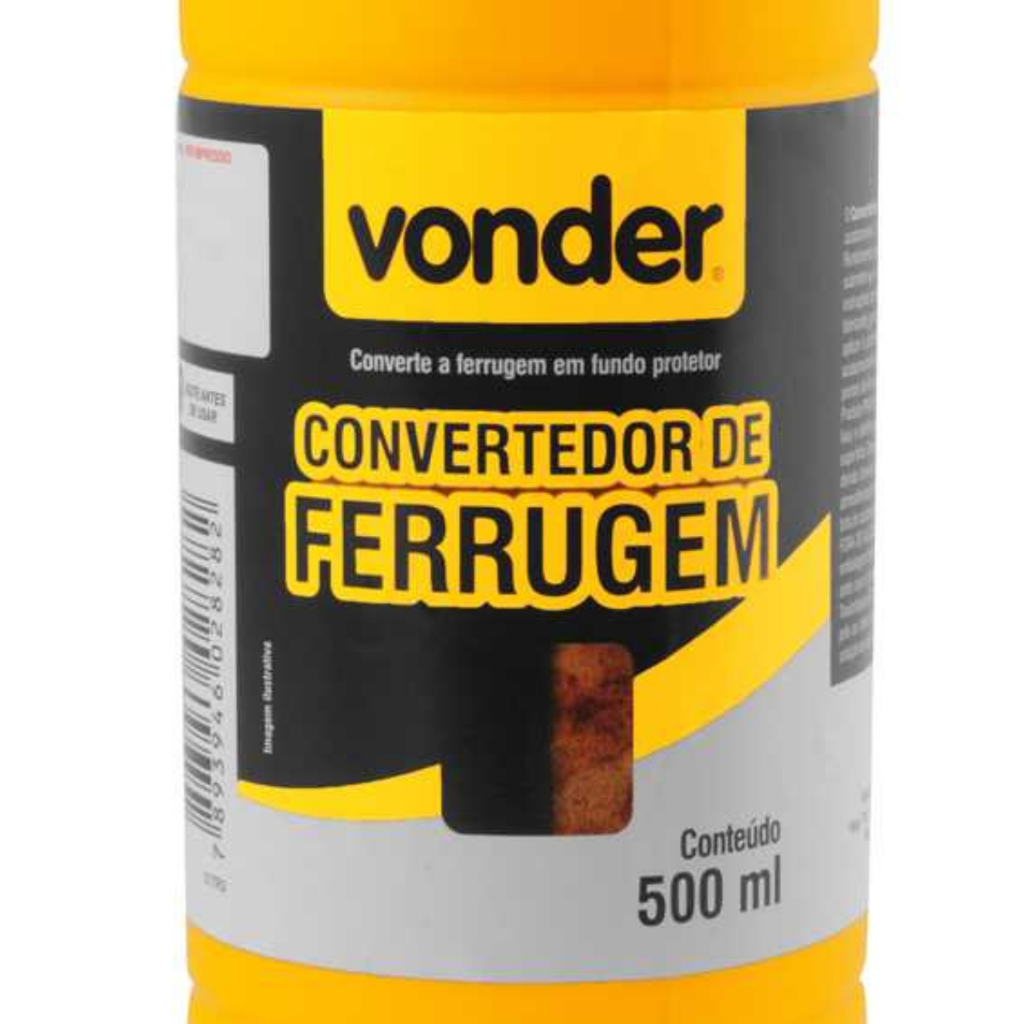 PRODUTO PRONTA ENTREGA COM ENVIO IMEDIATO Conteúdo da Embalagem: 1 Frasco com 500 ml. Produto pronto para o uso, não é necessário diluir. Não inflamável e não contém pigmentos tóxicos. Indicado para converter a ferrugem em um fundo protetor, pronto para receber tinta de acabamento. Sua aplicação é recomendada em: equipamentos industriais, veículos em geral, ferramentas, equipamentos agrícolas, portões, grades, fogões, geladeira, esquadrias, entre outras superfícies de ferro (sem tinta). Pode ser aplicado com pincel, rolo ou pistola. Nos casos em que for possível, pode-se utilizar também a imersão da peça no produto. Utilize somente sobre a ferrugem, não aplicar sobre a superfície de ferro que tenha qualquer tipo de tinta, pois o produto somente agirá sobre o metal. Dispensa a utilização de outros produtos. A aplicação ou manipulação do produto deve ocorrer em local arejado. Rendimento aproximado: 6 m² a 8 m² por litro para 1 demão. Não deve ser utilizado na parte interna de tanques de combustível. Garantia legal: 90 dias Detalhes Técnicos Conteúdo: 500 ml Massa aproximada (peso): 0,57 kg