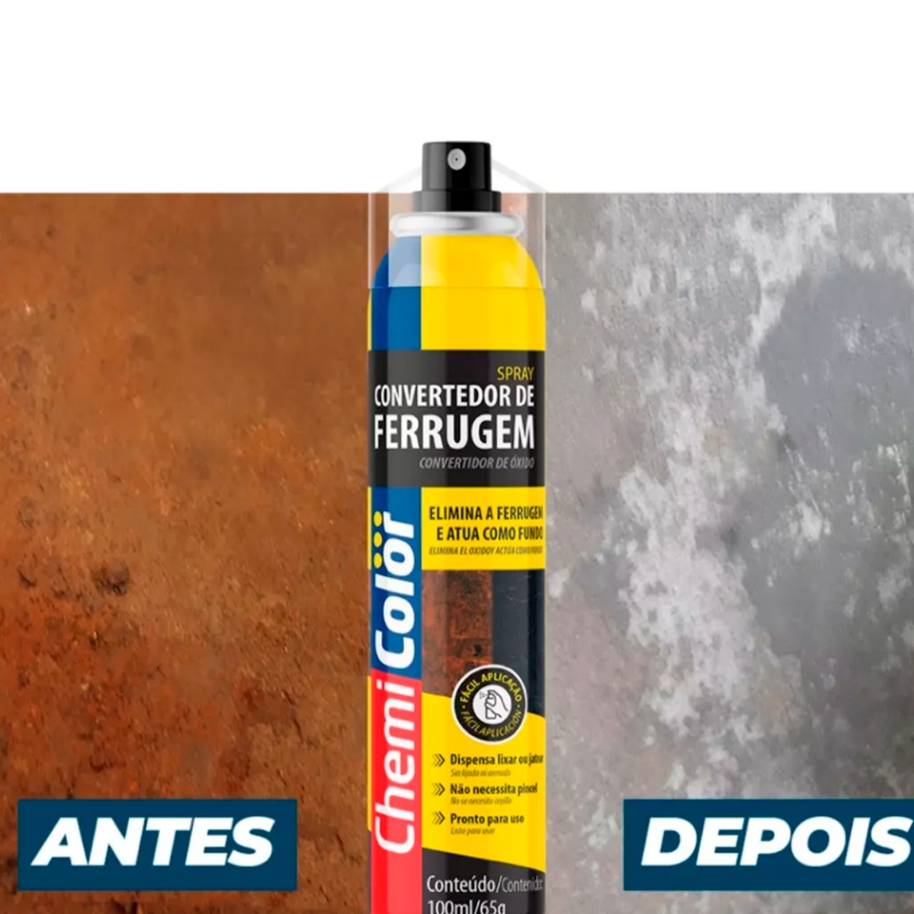 COMERCIAL VIPASA DISTRIBUIDORA.🛠️ CONVERTEDOR DE FERRUGEM 100ML 65G – CHEMICOLOR – REF. 0680491Transforme superfícies enferrujadas em bases prontas para pintura com o Convertedor de Ferrugem Chemicolor 100ml. Um produto prático, eficiente e indispensável para quem trabalha com manutenção, reforma ou restauração de estruturas metálicas, grades, portões, ferramentas, veículos e muito mais.✅ Características do Produto:Marca: ChemicolorReferência: 0680491Conteúdo: 100ml (peso aproximado: 65g)Função: Converte ferrugem em superfície estável e prepara para pinturaAplicação: Pincel, rolo ou esponjaCor após aplicação: Preto foscoSecagem ao toque: 30 minutosSecagem total: 24 horasRendimento aproximado: 6 a 8 m² por litro (rende até 0,8 m² com 100ml)Produto à base de água – não inflamável🧪 Modo de Uso:Remova o excesso de ferrugem solta com escova de aço ou lixa.Aplique o produto puro sobre a área oxidada.Aguarde a reação (de 6 a 12 horas).Após a secagem, aplique tinta de acabamento se desejar.🛠️ SPRAY CONVERTEDOR DE FERRUGEM TF7 300ML 270G – REF. 356734O Spray Convertedor de Ferrugem TF7 300ml é ideal para aplicações rápidas, práticas e uniformes, principalmente em áreas de difícil acesso. Indicado para uso automotivo, industrial e doméstico, ele neutraliza a ferrugem e forma uma base para pintura, evitando o avanço da corrosão.✅ Características do Produto:Marca: TF7Referência: 356734Conteúdo: 300ml (peso líquido: 270g)Embalagem em aerosol – aplicação direta e uniformeCor após aplicação: Preto foscoSecagem ao toque: 15 a 30 minutosSecagem total: 24 horasRendimento aproximado: até 3 m²Fácil manuseio – ideal para superfícies verticais ou com detalhes🧪 Modo de Uso:Agite bem a lata por pelo menos 1 minuto.Pulverize sobre a ferrugem limpa (sem pó ou óleo).Mantenha 20cm de distância da superfície.Aguarde a secagem completa para repintura.convertedor de ferrugem, spray tf7, converter ferrugem, neutralizador de ferrugem, antiferrugem, base para pintura metálica, anticorrosivo, produto para ferrugem automotiva, proteção contra ferrugemConvertedor de Ferrugem 100ml Chemicolor Base para Pintura AntiferrugemSpray Convertedor de Ferrugem TF7 300ml Antiferrugem Secagem RápidaChemicolor 100ml + TF7 300ml | Convertedor de Ferrugem – Opções em Líquido e SprayCOMERCIAL VIPASA DISTRIBUIDORA.