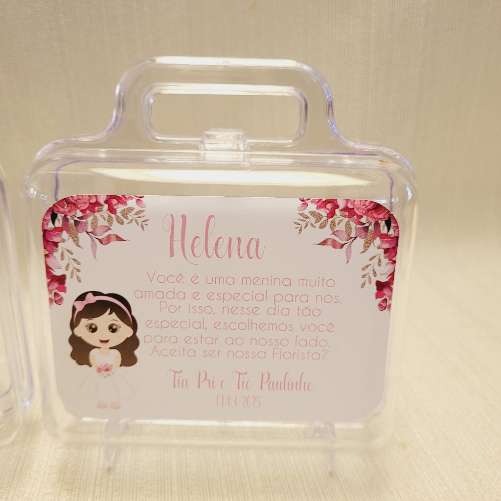 Maletinha Convite Infantil para Casamento - Personalizado com Nome, Data e Cargo Emocione seus pequenos convidados com este convite super especial! Nossa maletinha personalizada é perfeita para presentear Daminhas, Pajens, Demoiselles, Floristas e até o Segurança das Alianças. O QUE VOCÊ RECEBE: • Maletinha transparente em acrílico com a medida 13cm x 12,8 cm x 7 cm(área util da maleta 9 cm de altura e 11 de comprimento) • Adesivo personalizado (fosco sem brilho) com nome da criança, data do casamento, desenho e frase DETALHES DO PRODUTO: • Material: Maletinha rígida transparente + adesivo em papel offset fosco • Adesivo impresso em alta qualidade, com cores vivas e corte eletrônico • As maletinhas são enviadas vazias, prontas para você rechear como quiser PERSONALIZAÇÃO: • Personalizamos com nome da criança, data, desenho e frase • Você pode escolher o modelo do personagem (daminha, pajem, florista, segurança das alianças ou demoiselles) • Também temos opções de flores em diferentes cores, para combinar com o tema do seu casamento • Escolher os modelos de bonecos nas fotos e nos enviar os números, junto com o nome e cargo de cada criança • A frase pode ser alterada conforme sua preferência (informe no chat após a compra) Após a compra, envie os dados para personalização em até 24h. Caso não envie, será enviado sem nome e data. ❗ Importante: • A arte usada é conforme o modelo do anúncio, com alterações apenas em nome, data, frase e personagem • Não enviamos arte para aprovação • Pequenas variações de cor podem ocorrer conforme a tela do seu celular ou computador 💬 DÚVIDAS? Fale com a gente pelo chat! Será um prazer te ajudar a tornar esse momento ainda mais especial 💖