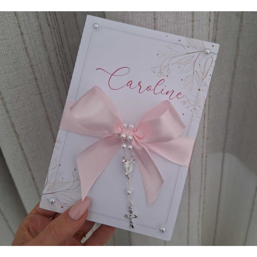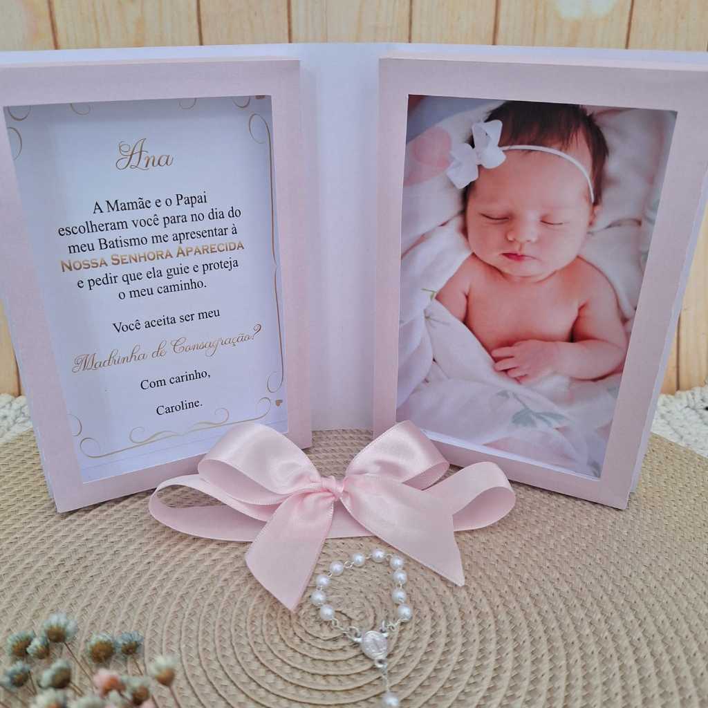 Esta peça une a delicadeza do acabamento artesanal com a emoção da fotografia, criando uma lembrança que será guardada com carinho para sempre. ✨ Diferenciais de Luxo: Foto em Alta Definição: Utilizamos Papel Fotográfico Premium para que a imagem do seu bebê tenha cores vivas e brilho impecável. Toque de Fé: Acompanha um lindo Mini Terço (dezena), simbolizando a bênção deste momento especial. Acabamento Delicado: Detalhes em pérolas aplicadas e um generoso laço de cetim que trazem sofisticação imediata ao convite. Qualidade Profissional: Confeccionado em papel cartão 180g (firme e resistente) com corte digital de alta precisão. 🛠️ Totalmente Personalizável: Versatilidade: Ideal para convidar Padrinhos de Batismo, Crisma, Consagração ou até "Padrinhos de Toalha". Texto Sob Medida: Você escolhe a mensagem! Pode ser um convite clássico, uma mensagem emocionante ou até uma "pergunta" surpresa. 📝 Como Personalizar seu Pedido: Logo após a confirmação do pagamento, envie-nos pelo Chat: Foto do bebê (com boa iluminação e resolução). Nome do bebê. Nomes dos Padrinhos. Texto desejado (caso queira alterar o modelo padrão). 📏 Especificações Técnicas: Material: Papel Cartão 180g e Papel Fotográfico. Detalhes: Pérolas e Laço de Cetim. Incluso: Convite personalizado + Mini Terço. Pronto para entregar: O convite já vai montado com todo o cuidado. Medidas: Convite Fechado: 11 x 16 x 3,5 cm Convite Aberto: 25 x 16 x 1,5 cm