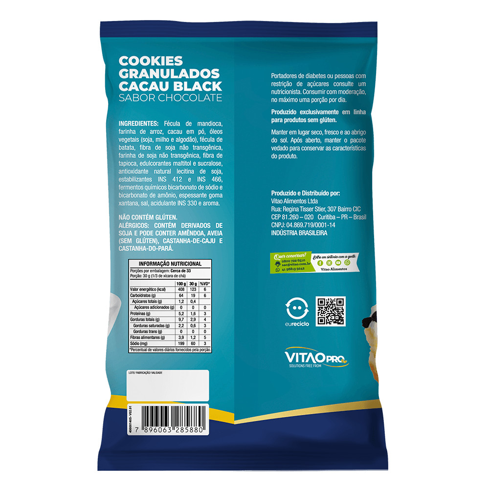 Os Cookies Black Granulado Sem Glúten VitaoPro, em embalagem de 1 Kg, são a escolha perfeita para quem busca sabor, saúde e praticidade, são ideais para dietas sem glúten, veganas, com zero adição de açúcares, mantendo o irresistível sabor do cacau. Uma opção leve, prática e saborosa para o preparo de lanches e sobremesas, sem abrir mão de uma alimentação saudável e equilibrada. Pedaços granulados e crocantes de cookie de cacau, ideais para dar textura e intensidade às suas receitas, trazendo sabor marcante e um toque gourmet para bolos, sobremesas e sorvetes. Versátil para criar camadas de sabor em coberturas, recheios ou para inovar em preparações artesanais. INGREDIENTES: Fécula de mandioca, farinha de arroz, cacau em pó, óleos vegetais (soja, milho e algodão), fécula de batata, fibra de soja não transgênica, farinha de soja não transgênica, fibra de tapioca, edulcorantes maltitol e sucralose, antioxidante natural lecitina de soja, estabilizantes INS 412 e INS 466, fermentos químicos bicarbonato de sódio e bicarbonato de amônio, espessante goma xantana, sal, acidulante INS 330 e aroma. ALÉRGICOS: CONTÉM DERIVADOS DE SOJA E PODE CONTER AMÊNDOA, AVEIA (SEM GLÚTEN), CASTANHA-DE-CAJU E CASTANHA-DO-PARÁ. NÃO CONTÉM GLÚTEN. SEM GLÚTEN, ZERO ADIÇÃO DE AÇÚCARES, ZERO LACTOSE, VEGANO.