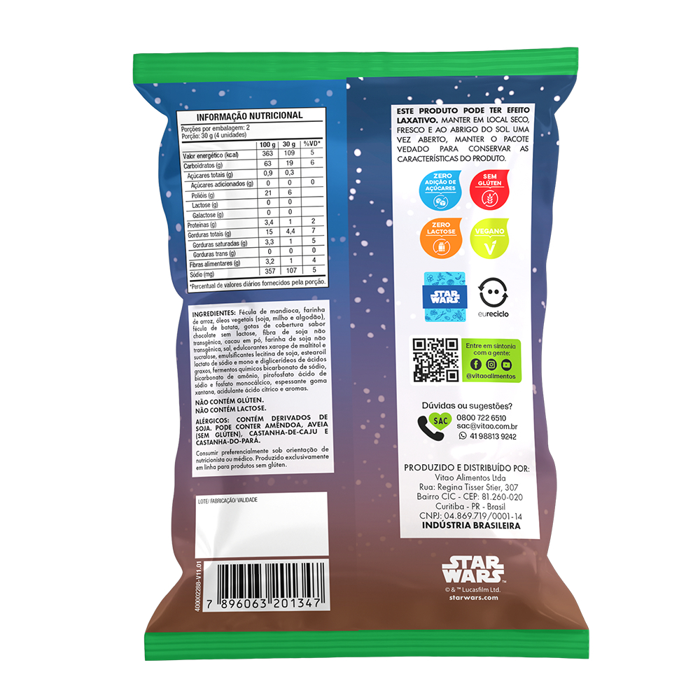 Descubra a magia do Cookies Disney sem glúten chocolate e zero adição de açúcares, uma deliciosa opção para quem busca um lanche crocante e cheio de sabor. Cada mordida traz a suavidade e o aroma envolvente da baunilha, para uma experiência única de sabor, combinado com qualidade e rotina saudável. INGREDIENTES: Fécula de mandioca, farinha de arroz, óleos vegetais (soja, milho e algodão), fécula de batata, gotas de cobertura sabor chocolate sem lactose, fibra de soja não transgênica, cacau em pó, farinha de soja não transgênica, sal, edulcorantes xarope de maltitol e sucralose, emulsificantes lecitina de soja, estearoil lactato de sódio e mono e diglicerídeos de ácidos graxos, fermentos químicos bicarbonato de sódio, bicarbonato de amônio, pirofosfato ácido de sódio e fosfato monocálcico, espessante goma xantana, acidulante ácido cítrico e aromas. ALÉRGICOS: CONTÉM DERIVADOS DE SOJA. PODE CONTER AMÊNDOA, AVEIA (SEM GLÚTEN), CASTANHA-DE-CAJU E CASTANHA-DO-PARÁ. NÃO CONTÉM GLÚTEN. NÃO CONTÉM LACTOSE. SEM GLÚTEN, ZERO ADIÇÃO DE AÇÚCARES, ZERO LACTOSE, VEGANO.