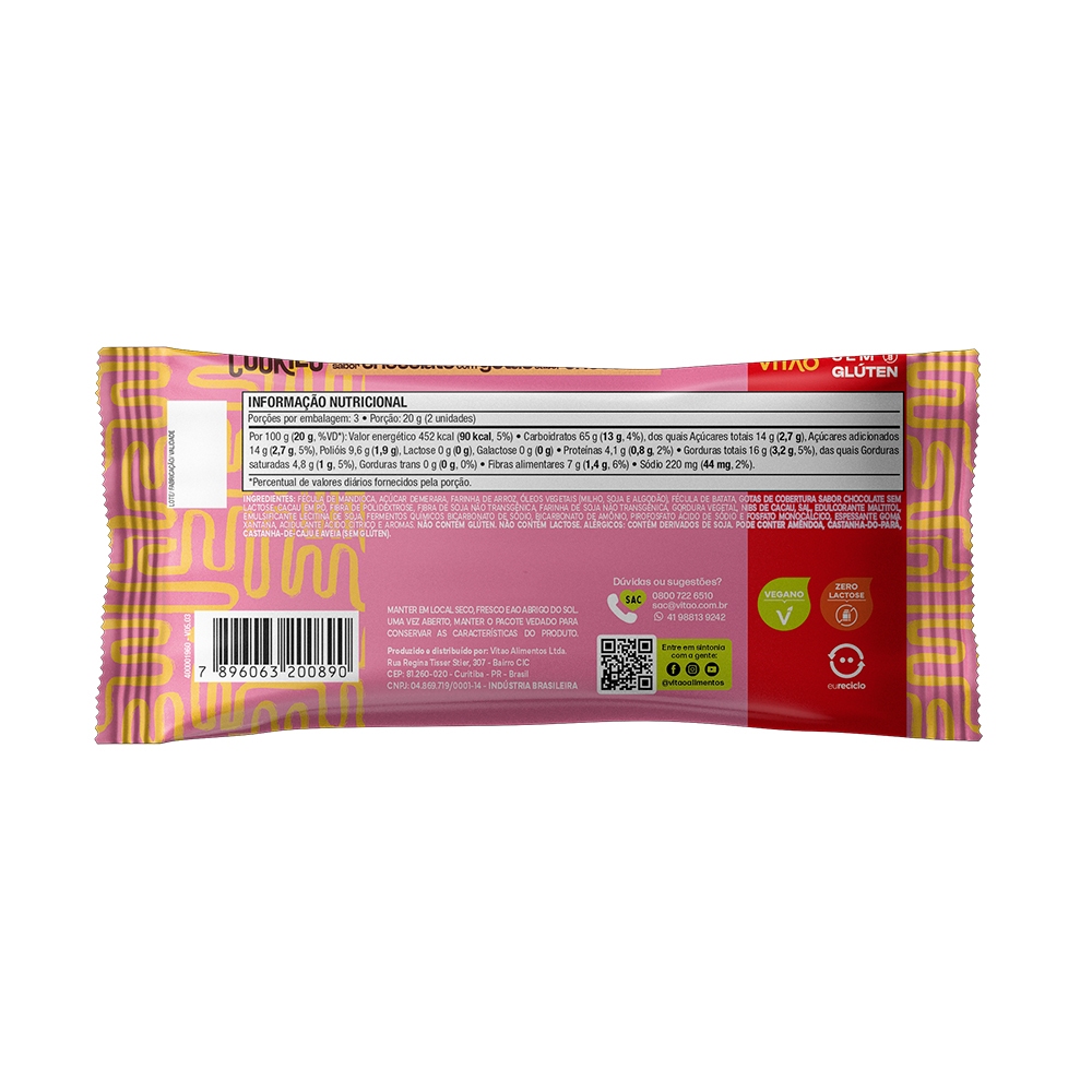 Os Cookies Tradicionais Sem Glúten sabor Chocolate com Gotas de Chocolate da Vitao são uma combinação perfeita de sabor e versatilidade. Totalmente livres de glúten, eles são ideais para quem segue uma dieta sem glúten ou possui intolerâncias alimentares. Com zero lactose e uma receita 100% vegana, esses cookies atendem também às necessidades de quem adota uma alimentação plant-based ou prefere evitar produtos lácteos. Sua textura crocante e o sabor intenso de chocolate, enriquecido com generosas gotas de chocolate, tornam cada mordida irresistível. Mais do que um lanche, eles são uma opção inclusiva e deliciosa para qualquer momento do dia. Feitos com cuidado e ingredientes selecionados, os Cookies Tradicionais Sem Glúten sabor Chocolate com Gotas de Chocolate da Vitao unem prazer e bem-estar. Perfeitos para um café da tarde, um snack rápido ou um momento de indulgência, eles oferecem sabor sem comprometer restrições alimentares. Veganos, zero lactose e sem glúten, são ideais para compartilhar com todos, garantindo um lanche inclusivo e cheio de sabor. INGREDIENTES: Fécula de mandioca, açúcar demerara, farinha de arroz, óleos vegetais (milho, soja e algodão), fécula de batata, gotas de cobertura sabor chocolate sem lactose, cacau em pó, fibra de polidextrose, fibra de soja não transgênica, farinha de soja não transgênica, gordura vegetal, nibs de cacau, sal, edulcorante maltitol, emulsificante lecitina de soja, fermentos químicos bicarbonato de sódio, bicarbonato de amônio, pirofosfato ácido de sódio e fosfato monocálcico, espessante goma xantana, acidulante ácido cítrico e aromas. ALÉRGICOS: CONTÉM DERIVADOS DE SOJA. PODE CONTER AMÊNDOA, CASTANHA-DO-PARÁ, CASTANHA-DE-CAJU E AVEIA (SEM GLÚTEN). NÃO CONTÉM GLÚTEN. NÃO CONTÉM LACTOSE. SEM GLÚTEN, ZERO LACTOSE, VEGANO.